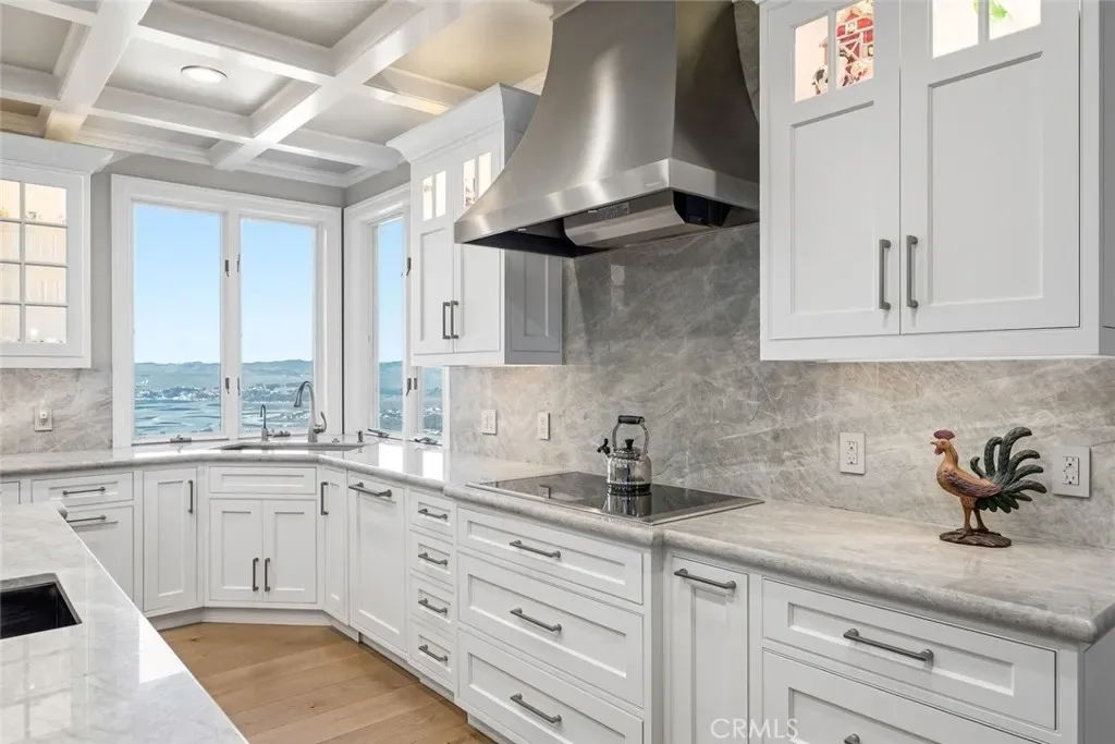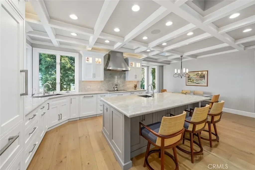 The chef’s kitchen is stunning, featuring beamed ceilings, layered cabinet lighting, large center island with seating, abundant storage, and sleek appliances.