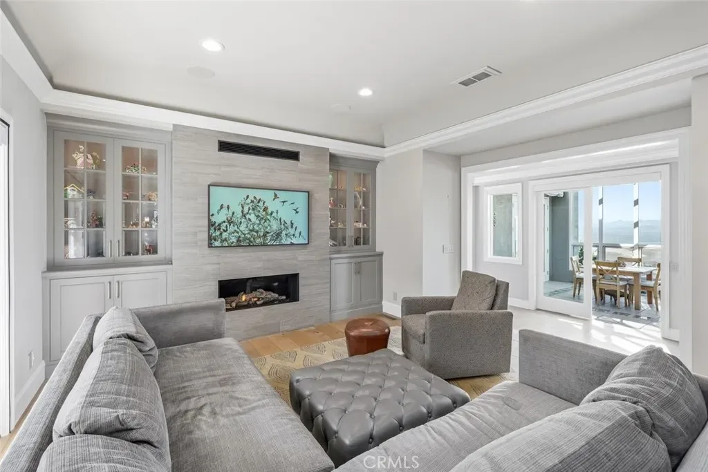 An informal living room adds warmth and intimacy with custom built-ins, crown molding, fireplace, and wet bar.