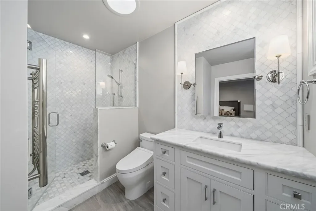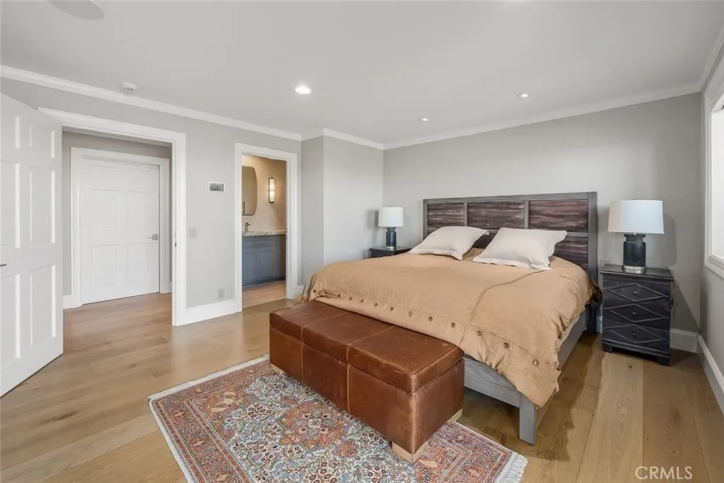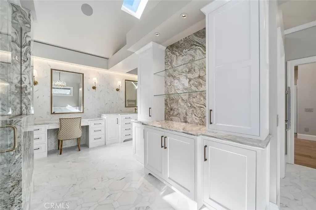 The owner’s suite is pure indulgence. Wake to endless ocean views from your private balcony, relax by the fireplace, or enjoy the built-in desk and seating area. The ensuite bath is a true sanctuary, featuring a chandelier, center island with drawers, custom wardrobe, dual vanities, an extra-deep soaking tub, walk-in shower, and two private toilet rooms with pocket doors. Just off the suite is the private office with its own courtyard entrance.
