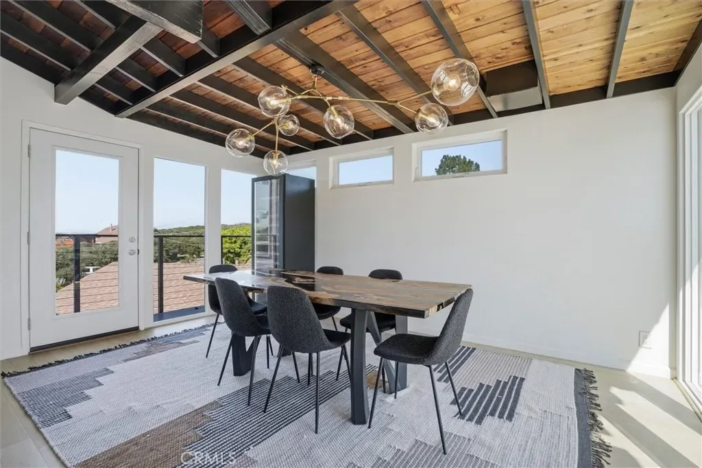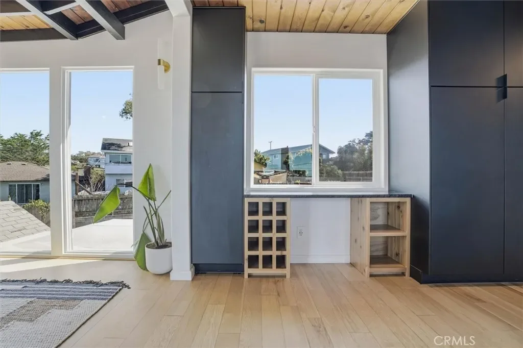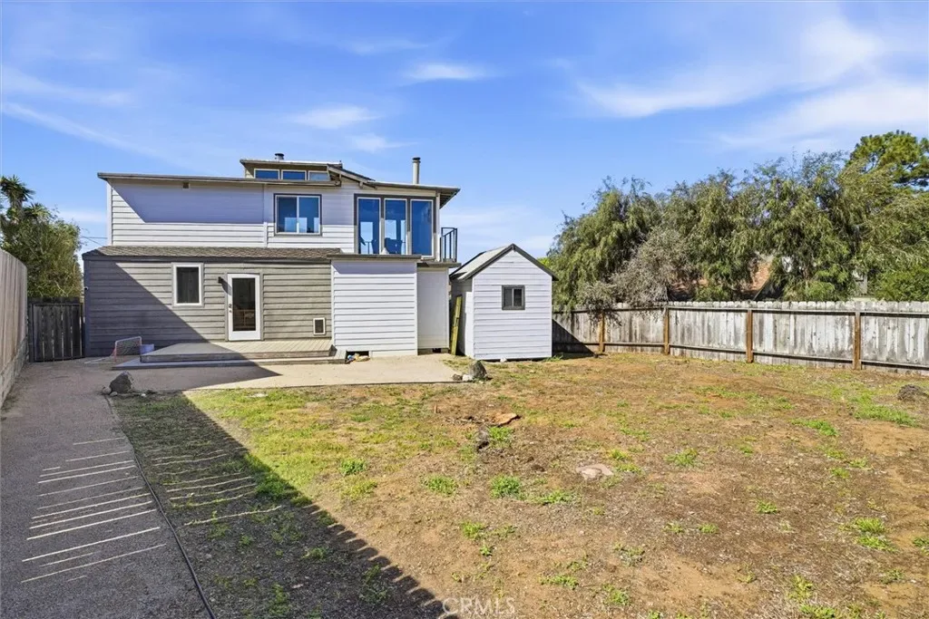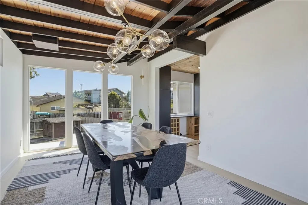 Discover this beautiful and unique modern home tucked away in a private, relaxing setting just 7 houses from the Elfin Forest and moments to Baywood Park. Thoughtfully designed, this home blends style with breathtaking natural surroundings. The wraparound balcony showcases sweeping views of the bay, Morro Rock, iconic Seven Sisters and spectacular sunsets. Inside, every room features beautiful exposed wood beam ceilings. Downstairs, the primary suite offers a spacious walk-in closet with laundry, shower, and custom double-sink vanity. There are also two guest bedrooms, one with access to the back yard, plus a separate 3/4 guest bathroom. Upstairs, the light-filled living room impresses with expansive windows, a freestanding fireplace, and French doors opening to the front balcony. The updated kitchen features black granite countertops, matching appliances and an adjoining spacious dining area with large viewing windows. There is a 3/4 guest bathroom for convenience. Outside, enjoy the large blank-space backyard ready for you to add your own personal touches and two convenient storage sheds. The front yard has planter boxes, a charming boardwalk walkway, carport and long driveway which provides extra parking . Located on a quiet cul-de-sac street, this one-of-a-kind coastal property offers privacy, beauty, and convenience.