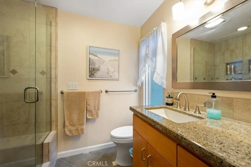 The kitchen is equipped with stainless steel appliances and quartz countertops, perfect for everyday living and entertaining. The primary bathroom has been beautifully updated and opens directly to the enclosed patio, which is filled with abundant natural light.