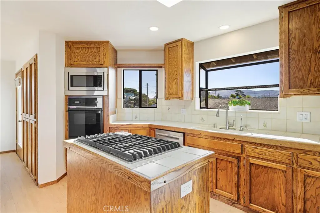 The expansive kitchen blends classic warmth with conveniences of a 5-burner range, oven, broiler, microwave, dishwasher, refrigerator, garden window with views of distant hillsides. The home offers exceptional storage throughout, upstairs in the main living areas and downstairs in the bedroom wing, laundry room, and oversized attached 2-car garage. The laundry room includes both 220V electrical and gas hookups. The finished garage is equipped with locking storage cabinets and a workbench, ideal for projects and organization.