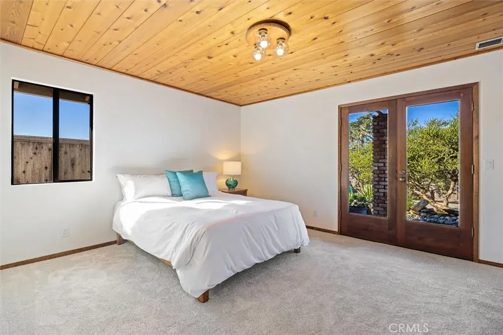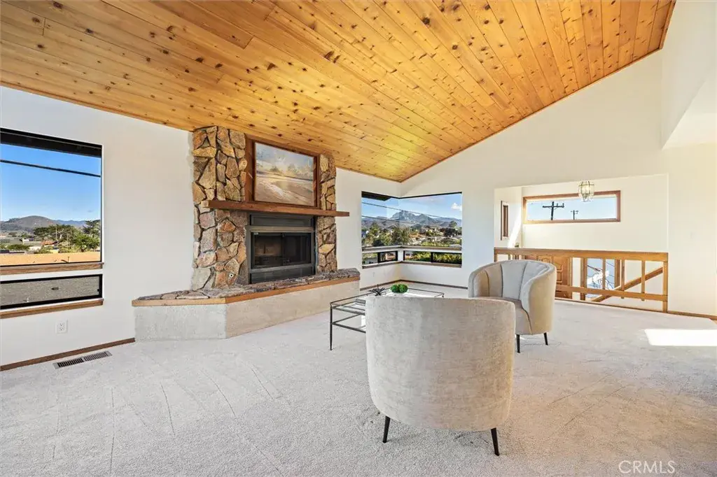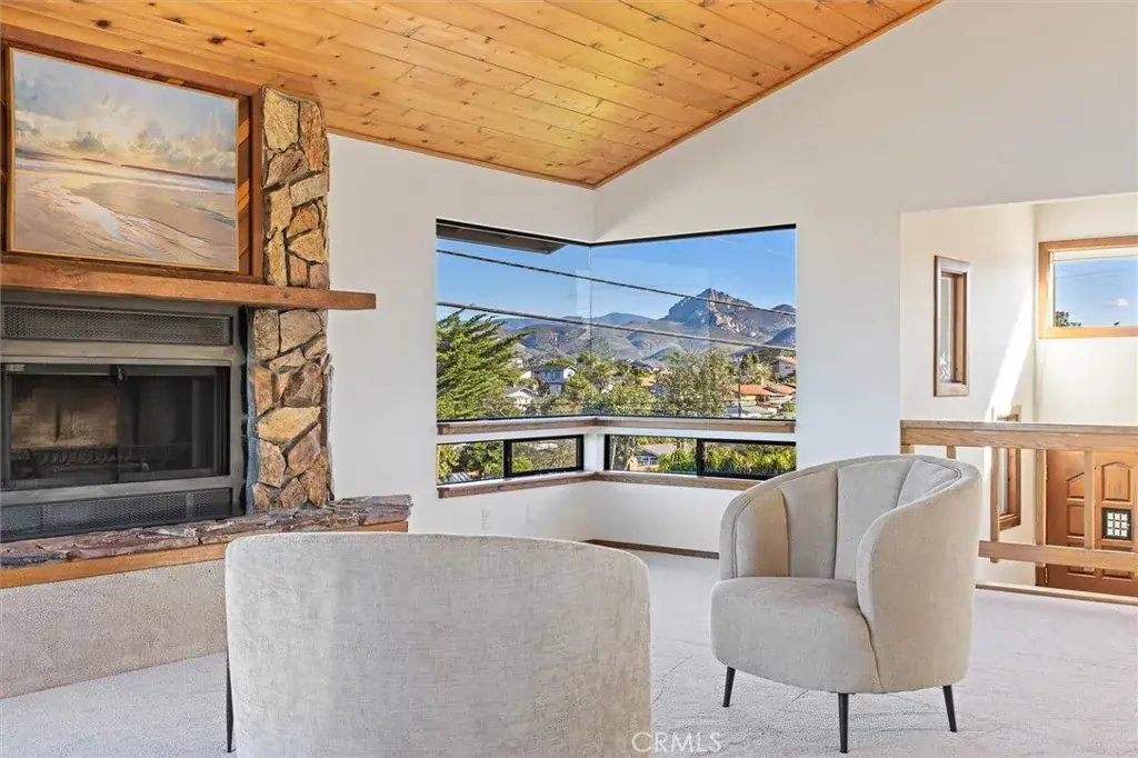The generous three-bedroom, two-bath plus powder room layout offers an ideal blend of comfort and functionality. The ensuite primary bedroom opens through French doors to a serene private patio and garden area, creating seamless indoor-outdoor living. Upstairs, the stunning vaulted cedar-ceiling living room showcases a dramatic granite-rock fireplace with both hearth and mantle. This light-filled space is anchored by large mitered-corner windows framing postcard views of the bay, the Rock, and the iconic peaks that define the Central Coast landscape. A built-in wet bar with glass hutch sits just off the dining area, perfect for entertaining.