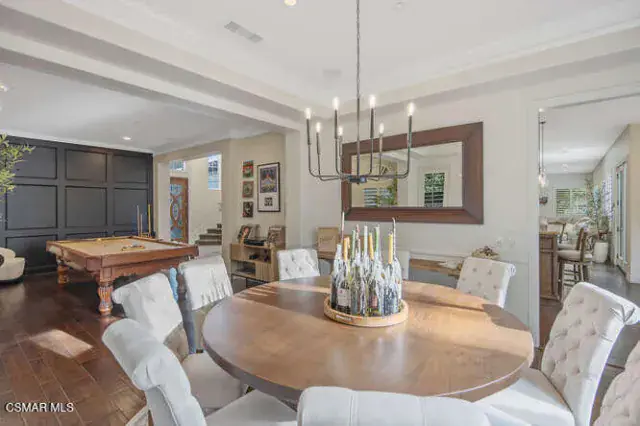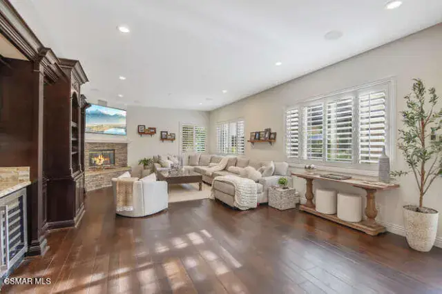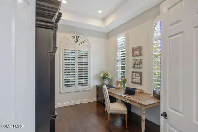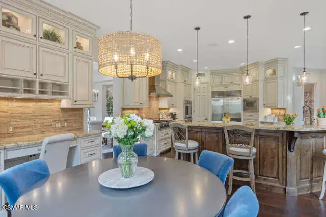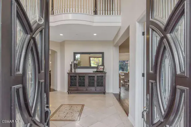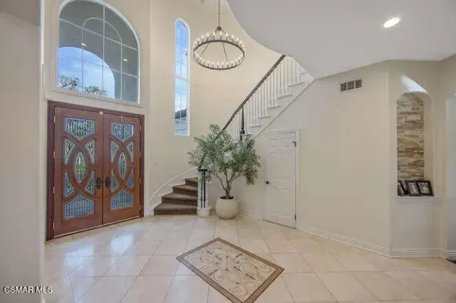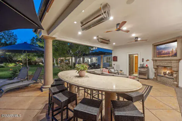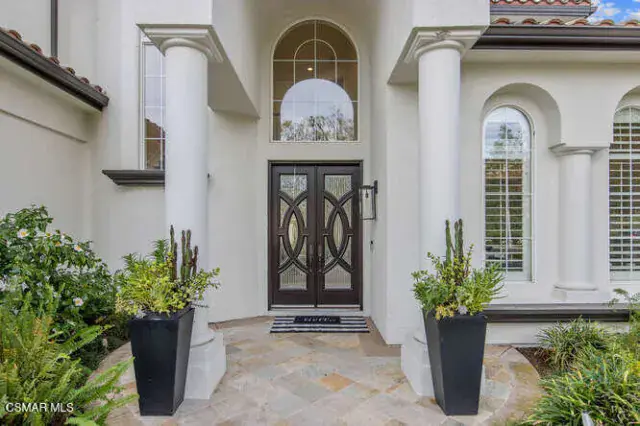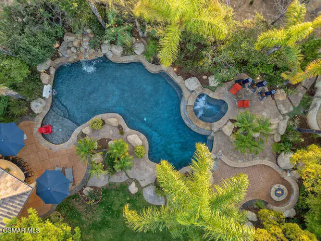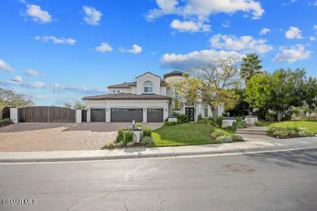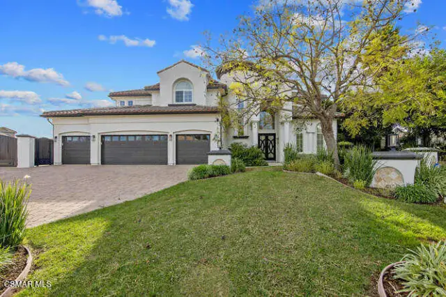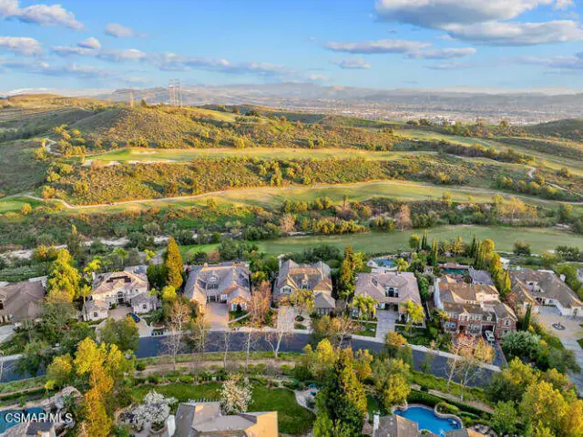 Located in the prestigious Moorpark Country Club Estates, a gated community nestled in the foothills of Moorpark and set alongside the Moorpark Country Club’s 27-hole championship golf course, this exceptional residence is tucked away on a quiet cul-de-sac and situated on an expansive almost 3/4 acre corner lot. Offering 5 bedrooms, 7 bathrooms, and almost 4,800 square feet, the home is thoughtfully designed for both everyday living and effortless entertaining. The interior features wood flooring, an open-concept updated kitchen and family room, formal living and dining rooms, and multiple fireplaces in the living room, family room, and outdoor living space. A downstairs office and guest bedroom with an ensuite bath provide ideal flexibility for guests or multigenerational living.Upstairs, the expansive primary suite serves as a private retreat with a sitting area, custom closet built-ins, dual toilet rooms, and a spa-inspired bath with a jacuzzi tub. All three secondary bedrooms on the second level include their own ensuite bathrooms, while a large upstairs loft functions as a second family room or media space. Surround sound is featured throughout the home.Step outside to a true private paradise featuring a resort-style pool and spa with a cascading waterfall and dramatic water wall feature, complemented by a fire pit and an impressive covered California room designed for year-round enjoyment. This extraordinary space includes a fireplace, built-in BBQ, a large island with seating for approximately 12, and ceiling-mounted gas heaters–creating the ultimate indoor-outdoor entertaining environment. A spa-inspired bathroom with steam shower and sauna are also located in the California room. Additional highlights include surround sound throughout the outdoor living areas and yard, large RV parking or sport court space, and fully owned solar complete this remarkable offering–blending luxury, privacy, and resort-style living in one of Moorpark’s most sought-after communities. Residents of the gated Moorpark Country Club Estates enjoy access to private neighborhood parks featuring basketball, pickleball, and tennis courts, picnic areas, playgrounds, and scenic equestrian trails that wind around the community, offering a truly resort-style lifestyle. All that’s missing is you!