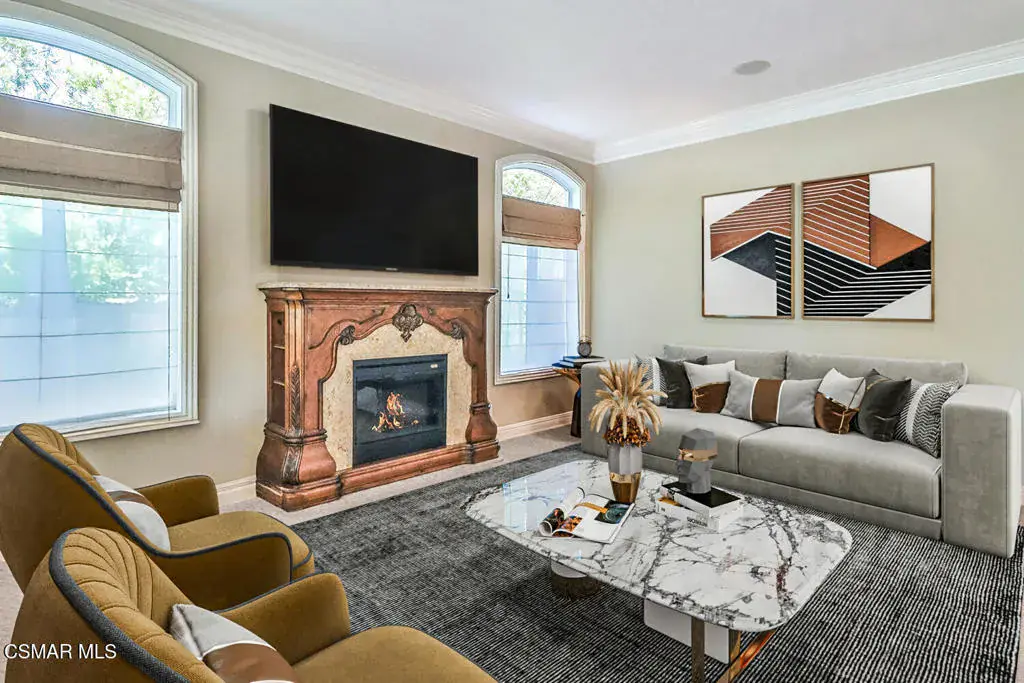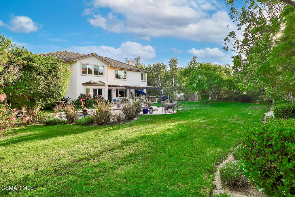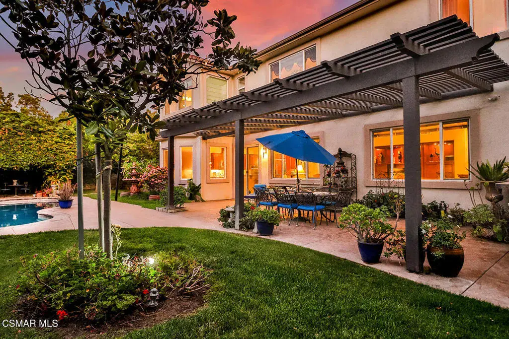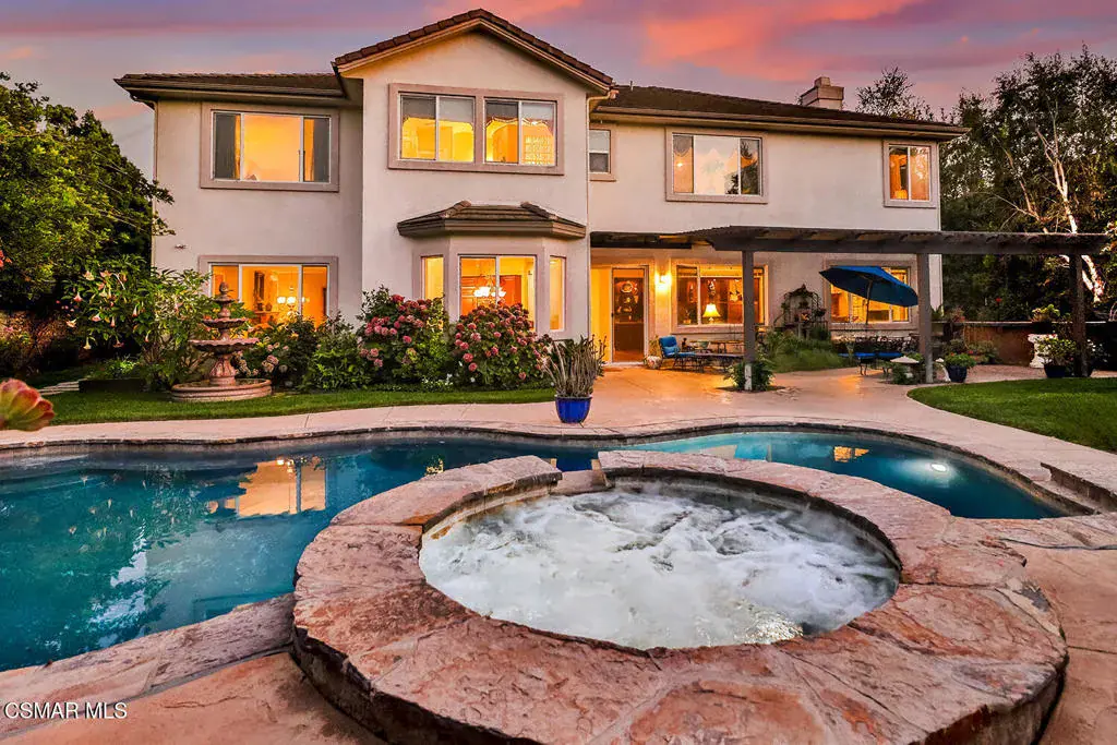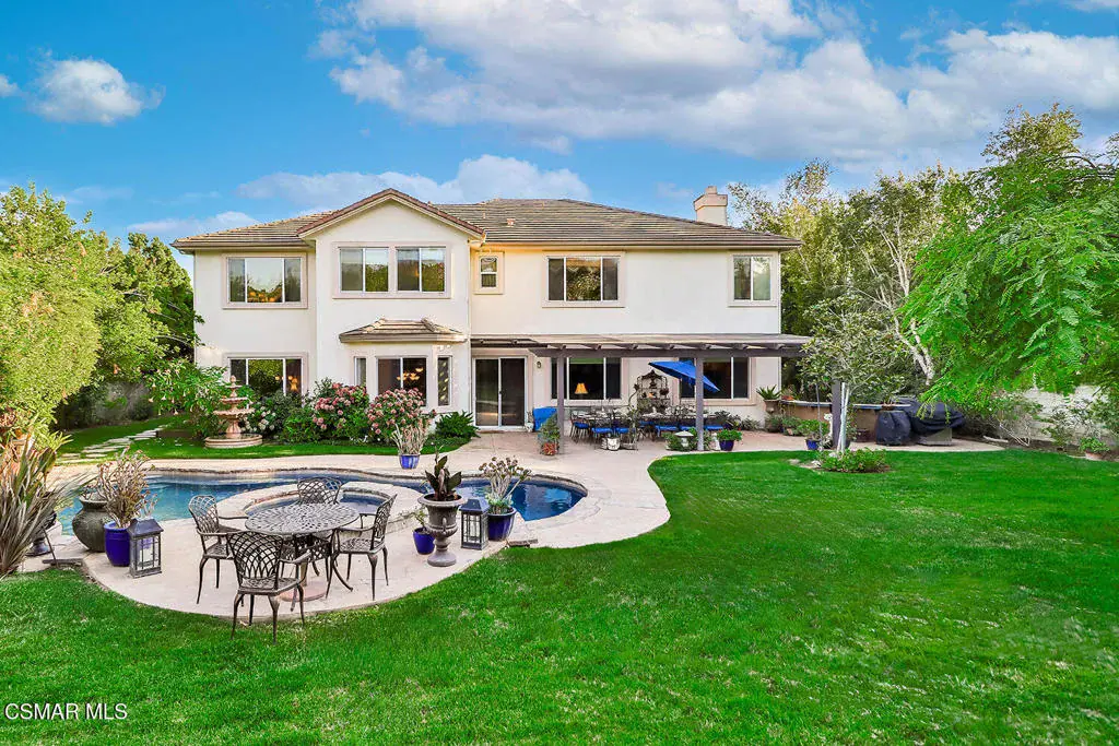 Welcome to your dream home nestled in the prestigious gated community of the Moorpark Country Club Estates–a perfect fusion of timeless elegance, resort-style amenities, and luxury. This stunning 5-bedroom, 6-bathroom estate offers a lifestyle of comfort, sophistication, and unforgettable entertaining, all set against the serene backdrop of rolling hills and meticulously landscaped grounds.From the moment you step into the grand foyer, you’ll be captivated by soaring cathedral ceilings, marble floors, and a sweeping staircase that sets the tone for the rest of the home. The formal living and dining rooms are beautifully appointed with breathtaking views of the lush backyard–ideal for both intimate dinners and festive gatherings.The heart of the home is the chef’s kitchen, featuring top-of-the-line appliances including a Viking range and hood, Electrolux double ovens, Bosch dishwasher, an oversized island, custom Italian tile backsplash, a walk-in pantry, and a cozy breakfast nook. Designed for functionality and style, this kitchen is built for both culinary creativity and everyday convenience.Enjoy seamless flow into the spacious family room, complete with built-in entertainment cabinetry, bar area, and a custom wood-burning fireplace–perfect for relaxed evenings or hosting friends. A conveniently located downstairs bedroom with a private en-suite bath offers an ideal space for guests or multigenerational living, along with a separate home office.Upstairs, retreat to the luxurious primary suite featuring mountain views, a private sitting area, and an expansive spa-inspired bathroom with dual vanities, jetted soaking tub, oversized walk-in shower, and a generous walk-in closet. Three additional bedrooms, each with private en-suite bathrooms, offer exceptional comfort and privacy. An additional loft space upstairs provides the perfect flexible area–ideal as a media room, play space, secondary office, or cozy retreat.Step outside into your private resort-style oasis, designed for pure enjoyment. A sparkling pool and spa with a custom rock waterfall, built-in BBQ bar, lush landscaping, mature fruit trees, a tranquil herb garden and multiple lounging areas complete this entertainer’s paradise.Additional features include a 4-car garage, dual-zone climate control, and access to community tennis courts, pickleball, a playground, and scenic walking trails. Just minutes from Moorpark’s top-ranked 27-hole country club golf course, this estate is more than a home–it’s a lifestyle.Don’t miss your chance to own one of Moorpark’s most extraordinary properties. Schedule your private showing today and experience luxury living at its finest. Some photos have been digitally staged.