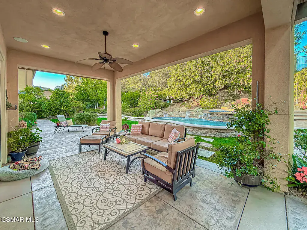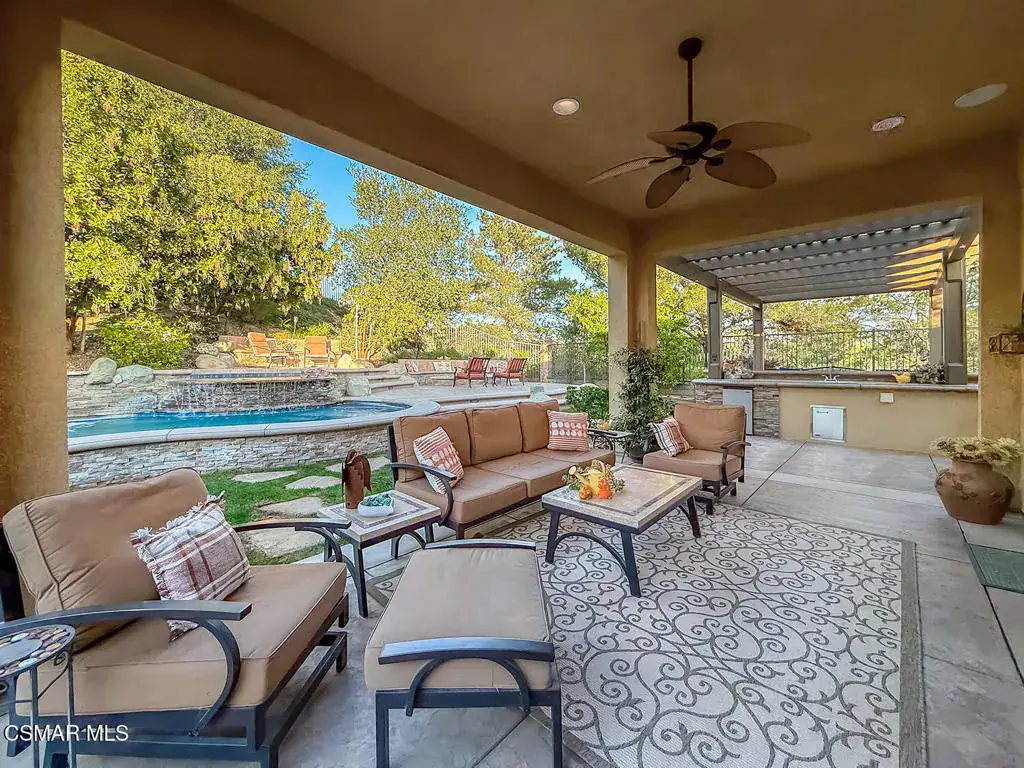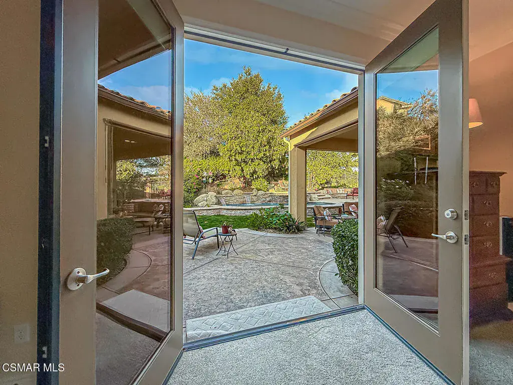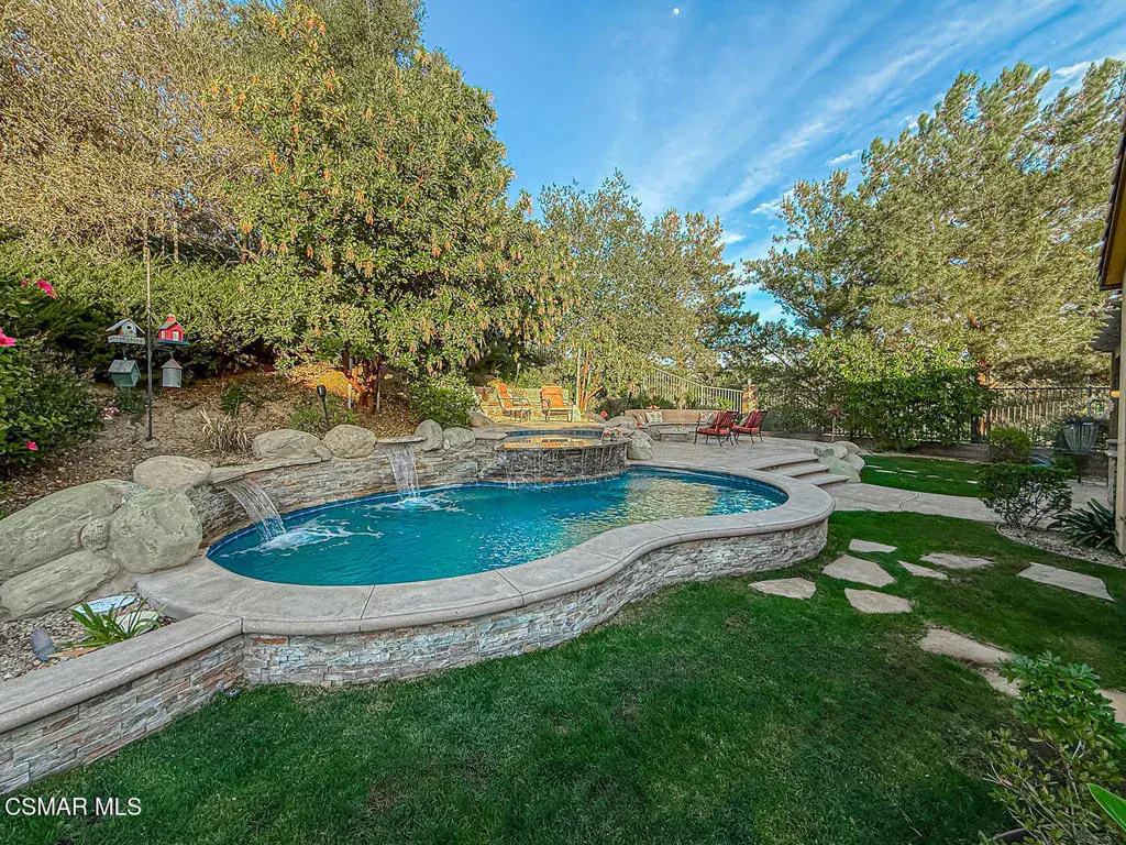 Welcome to this beautifully appointed single-story residence set on an oversized 17,000+ sq ft private flag lot in one of Moorpark’s most desirable neighborhoods. Offering views, privacy, and seamless indoor-outdoor living, this home is designed for both comfort and entertaining. Step inside to a light-filled, open floor plan highlighted by hardwood floors, crown molding throughout, and an integrated sound system that enhances everyday living. The heart of the home is the spacious chef’s kitchen featuring stainless steel appliances, granite countertops, and a large center island, perfect for gatherings and casual dining. The living spaces flow effortlessly to the backyard through expansive pocket doors, creating a true California indoor-outdoor experience. The generously sized primary suite offers a peaceful retreat, complemented by a large spa-like primary bath with dual vanities, creating both function and luxury. Additional bedrooms are well-proportioned and thoughtfully laid out, ideal for family, guests, or a home office. Outside, enjoy a resort-style setting complete with a sparkling pool and spa, built-in BBQ, fire pit, and multiple seating areas — all framed by scenic hillside views and mature landscaping. This rare offering combines single-story convenience, premium finishes, and an entertainer’s backyard in a quiet, sought-after location close to parks, schools, shopping, and freeway access.