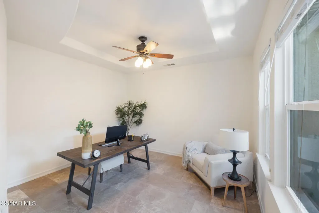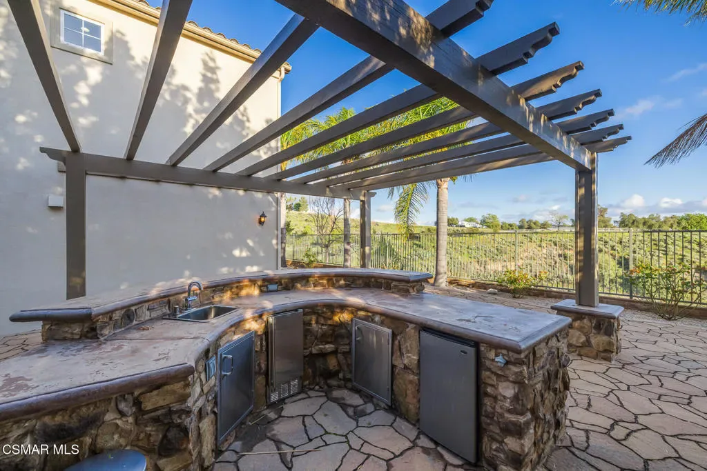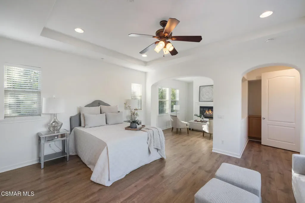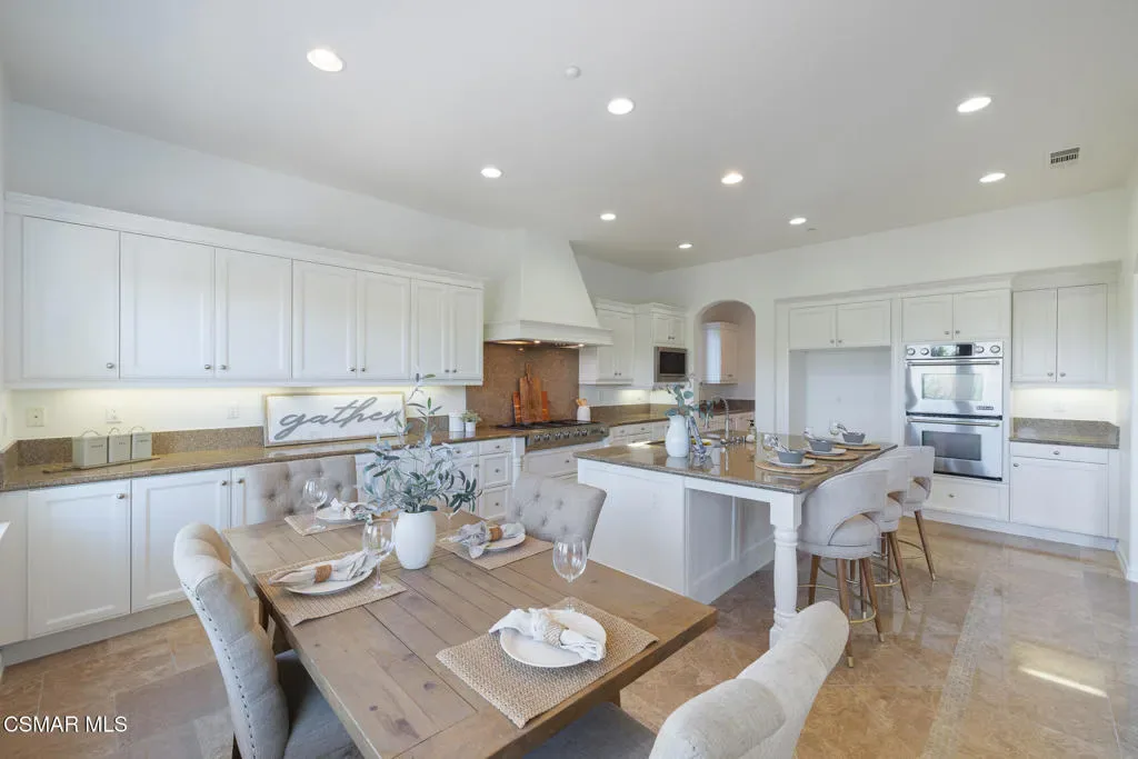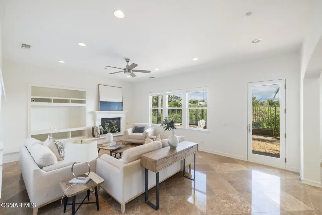 This exceptional home offers over 4,200 square feet, 5 bedrooms, each with en-suite bathrooms, with one located conveniently downstairs, an incredible floor plan with a paver-enhanced backyard made for entertaining or relaxing in the prestigious gated community of Meridian Hills.This beautifully maintained residence sits at the end of a quiet cul-de-sac, capturing stunning mountain and sunset views. Offering 5 bedrooms, 5.5 baths, a spacious loft and a private office, the home spans over 4,200 square feet of thoughtfully designed living space.A dramatic entry welcomes you with a sweeping staircase, soaring ceilings, recessed lighting and elegant stone flooring throughout the main level. Formal living and dining rooms provide ideal spaces for entertaining, while a charming private courtyard enhances seamless indoor-outdoor living.The chef-inspired kitchen is appointed with premium stainless steel appliances, granite countertops, abundant cabinetry, large island with seating, breakfast nook, walk-in pantry and butler’s pantry. The kitchen opens effortlessly to the light-filled family room, highlighted by expansive windows, a cozy gas fireplace, media niche and new ceiling fan.The main level features a full bedroom with en-suite bath, a dedicated office and a powder room–perfect for guests, multigenerational living, or flexible work-from-home needs. Upstairs, a spacious loft offers an additional gathering space, along with a convenient laundry room and three secondary bedrooms.The luxurious primary suite serves as a serene retreat, showcasing beautiful views, a private sitting area with fireplace, a spa-inspired bath with dual vanities, soaking tub, glass-enclosedshower and an oversized walk-in closet.The entertainer’s backyard is designed for year-round enjoyment with multiple seating and play areas, custom pavers throughout, a gas fire pit, fruit trees and breathtaking mountain vistas. An outdoor built-in bar complete with sink, refrigerator and freestanding gas BBQ creates the perfect setting for hosting family and friends.Additional highlights include fresh interior and exterior paint, new high-end wood laminate flooring throughout the entire second level, dual-zone HVAC with smart controls, video doorbell and security cameras and a three-car tandem garage.Residents of Meridian Hills enjoy resort-style amenities including a community pool and spa, clubhouse, BBQ area, playground, and tennis courts–all conveniently located near Moorpark Country Club, top-rated schools, parks, dining and shopping.An exceptional opportunity to own in one of Moorpark’s most sought-after gated communities.