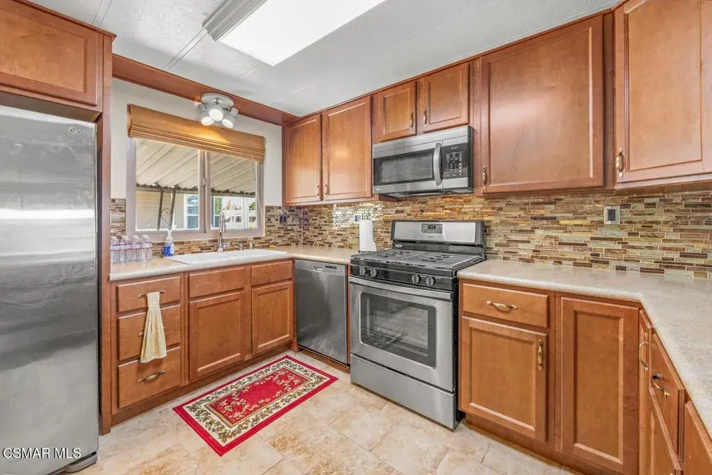 Welcome to this charming and well-maintained home located in the desirable Moorpark family-friendly community of Villa Del Arroyo, uniquely positioned backing to a protected arroyo and scenic walking trails. With tranquil views and a private setting, this home offers a rare blend of nature, comfort, and convenience.This 2-bedroom, 2-bath residence offers approximately 1,152 sq. ft. of living space and features a semi-open floor plan filled with abundant natural light, creating a bright and welcoming atmosphere throughout. The spacious living and dining areas flow seamlessly into the remodeled kitchen, which features newer cabinetry, new countertops, a stylish tile backsplash, and ample storage space. All kitchen appliances are included, making the space both functional and move-in ready for everyday living.Step outside to enjoy the private fenced yard with a covered back porch, perfect for relaxing, entertaining, or taking in the peaceful arroyo views. A side lawn with an additional fenced area provides flexibility for pets, gardening, or outdoor enjoyment. Additional highlights include tile flooring, landscaped grounds with automatic sprinklers, a covered front porch, an expanded covered carport, and a large shed with electricity–ideal for a workshop or extra storage.Residents of the highly regarded A+ Villa Del Arroyo community enjoy access to a clubhouse, pool and spa, tennis courts, horseshoe pits, pool tables, community gardens, RV parking, and nearby hiking and biking trails. Conveniently located near Moorpark College, local parks, shopping, dining, and everyday essentials, this home offers an exceptional lifestyle opportunity.A rare offering with a serene natural backdrop — come see it for yourself!