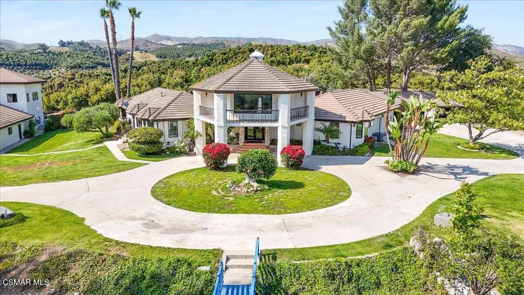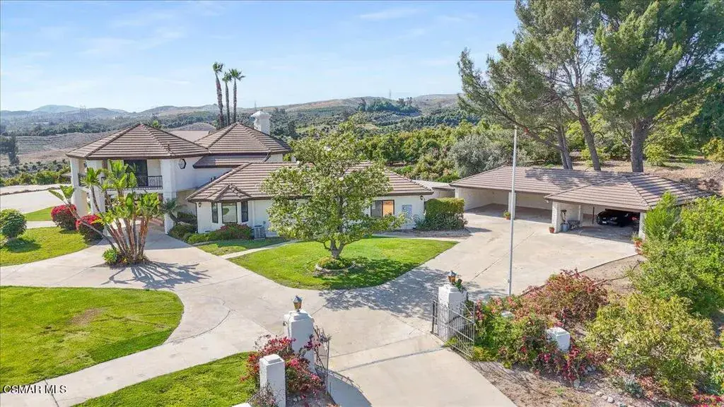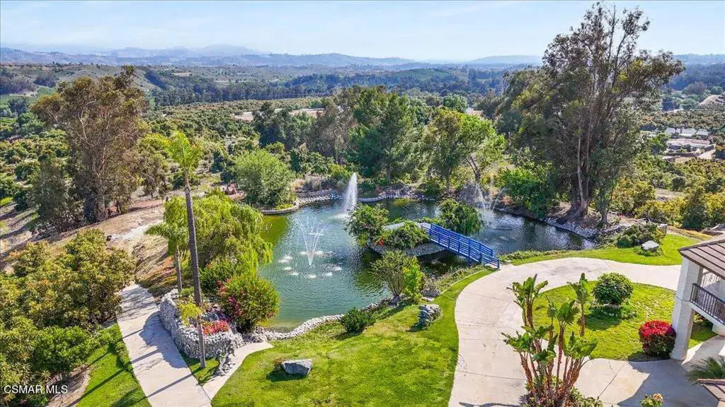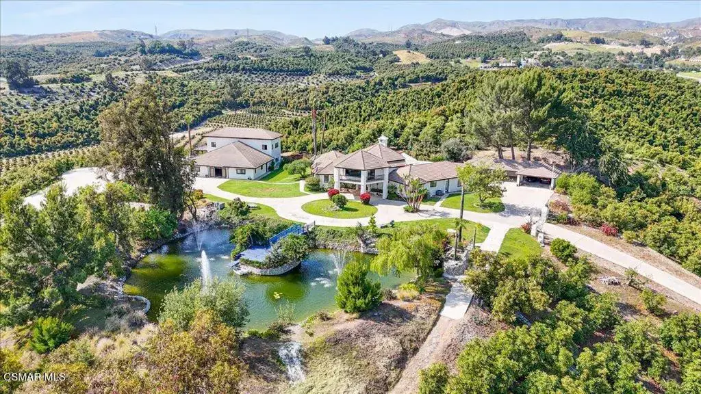 Enjoy panoramic views of the ocean, Channel Islands, and surrounding mountains from this extraordinary hilltop property. Spanning two side-by-side parcels, this private estate offers endless possibilities. The main residence with 3 bedrooms is thoughtfully designed for indoor-outdoor living. You will be whisked away as soon as you walk through the double front doors into the grand Tuscan great room boasting soaring ceilings open to the second story and two sets of floor-to-ceiling French doors and windows with the royal fireplace centered in-between, opening to the pool area and bathing the space in natural light. A separate media room with a luxurious wood built-in wall unit and French doors facing the pool provides an elegant space to relax or entertain, with a half bath offering direct access to the pool and spa area. A spacious kitchen overlooking your private pond features a movable island, endless counter space, sitting bar plus eat-in area, and a dishwasher, while the connected laundry room includes a sink, counter space, cabinetry, and a walk-in pantry. A powder room is conveniently located right off the kitchen and dining for your guests.Nearly every room has doors leading outside, all adorned with plantation shutters as well as the windows. The ground-level primary suite offers a spa-like retreat with a soaking tub, walk-in shower, and an expansive cedar-lined walk-in closet. Additional features include a formal dining room, a guest bedroom with a Murphy bed, and a luxurious, upstairs office/library with rolling ladder, hidden half bath, and a wrap around balcony overlooking the koi pond and views in all directions. You will feel like royalty in your palace. *** Outdoor highlights include a sparkling pool and spa, gazebo, built-in BBQ into the chimney (designed for easy conversion to a pizza oven), and a free-standing, tree-shaded relaxation deck for morning coffee with the sounds of birds chirping or afternoon breezes…. Do I sense a nap headed your way? The impressive 8-ft-deep koi pond features a waterfall, spouting fountains, a bridge leading to the deck, and even a rowboat.The second structure includes: ** A wine tasting room with temperature-controlled wine storage for hundreds of bottles, sink, dishwasher, and mini fridge **Two oversized upstairs rooms with stunning views and deck access facing the islands ** A fully equipped ADU with kitchen, living room, walk-in closet, more storage closets, and separate bedroom ** A ‘barn’ space with tool/equipment rooms. The main portion of the barn centered in the building and open to the second level is a partially constructed sound studio with in-floor channeling for wiring–ideal for music, events, or expanded wine tasting with French doors leading outside to more flat, concrete space to entertain. Additional amenities include a 6 car carport (one bay is extra deep for storage or more parking), a private helicopter pad, various fruit trees, and approximately 7 acres of avocado groves. This is a rare opportunity to own a truly one-of-a-kind estate with commanding views, exceptional amenities, and versatile space for entertaining, relaxing, or working from home. ** Main house is 3 beds, office/library, two full baths, 3 half baths 3,917 sqft. ** Living area = main house + ADU 450 is 4,367 sqft. ** 2nd Structure (the Barn) is guest quarters (living area, kitchen, 1 bath, and separate bedroom (450 sqft) Wine Room, craft room(?) Barn/tools/equipment rooms, two large rooms upstairs with deck is 4,267 sqft. ** Sale includes TWO parcels: APN 502-0-080-065 (7.80 acres) and APN 502-0-080-095 (2.27 acres).