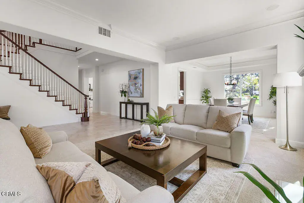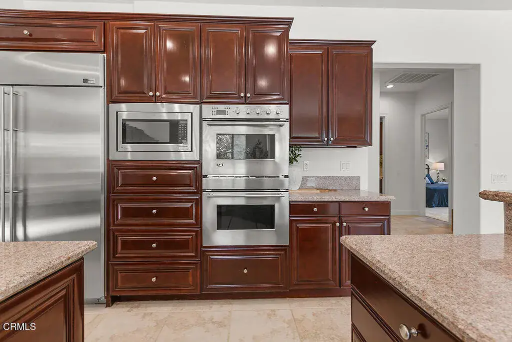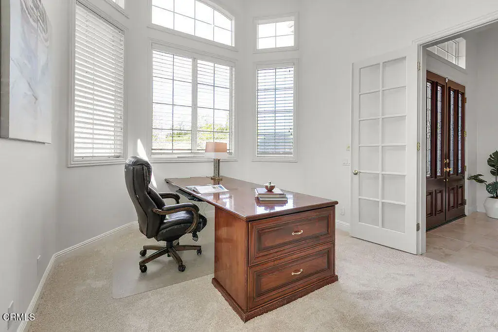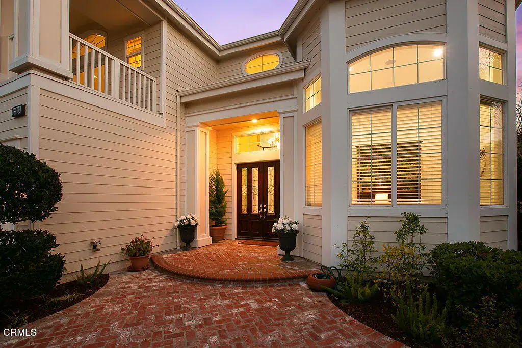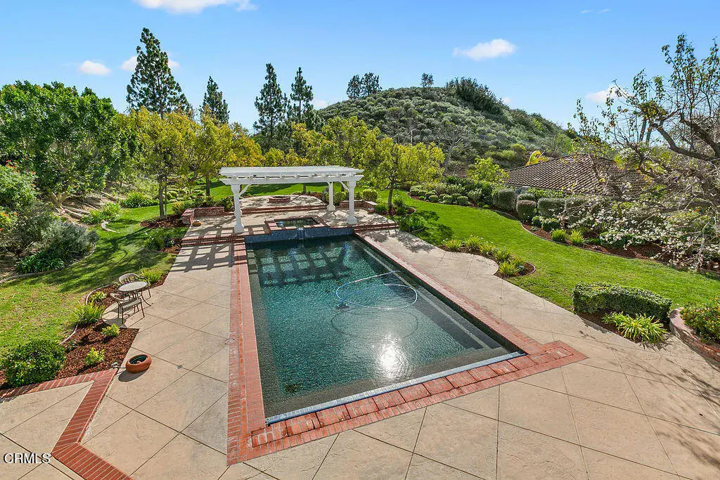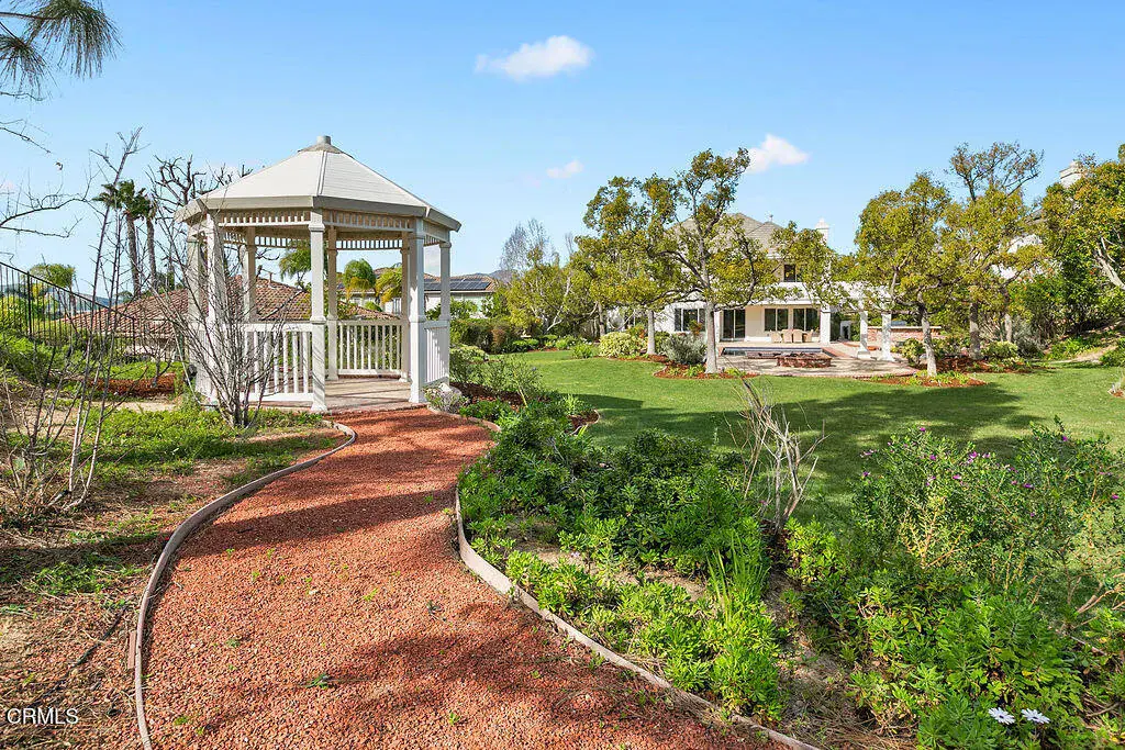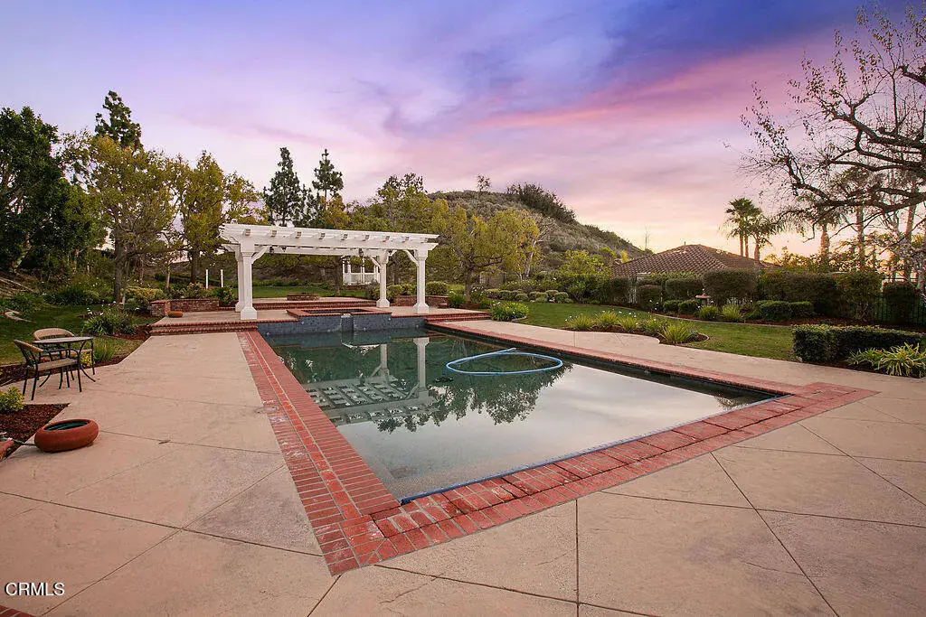 This is the home everyone has been waiting for–a stunning retreat nestled within the exclusive Moorpark Country Club Estates. This highly desirable Silverado model showcases timeless finishes and is perfectly positioned on a premium three-quarter-acre lot offering privacy, elegance, and resort-style amenities.The expansive grounds feature lush landscaping, a gazebo, sparkling pool with elevated spa, firepit, and a private lookout overlooking the championship golf course–creating an outdoor setting that is both serene and unforgettable. Few homes offer this level of seclusion paired with sweeping views.Inside, discover nearly 5,200 square feet of refined living space, including 5 bedrooms, 6 baths, an executive-level office, and multiple private balconies designed to capture the surrounding vistas. The charming Cape Cod exterior carries through to a classically elegant interior with a formal entry foyer, crown molding, traditional staircase, and three fireplaces.Designed to accommodate every lifestyle need, the grand floor plan includes a downstairs bedroom and bath, formal living and dining rooms, and expansive gathering spaces perfect for entertaining. Upstairs, ‘princess suite’ bedrooms with Juliet balconies invite you to linger and enjoy breathtaking sunsets.The gourmet kitchen is the heart of the home, offering generous storage, stainless steel appliances, a built-in GE Profile refrigerator, breakfast bar, and walk-in pantry–ideal for hosting family and friends.Step outside to endless possibilities. Swim, sunbathe, barbecue, or relax in the covered California room. The pebble-finish pool with retractable cover provides peace of mind–keeping it warm, child-safe, and protected year-round. Stroll to the edge of the property to watch golfers pass by, or unwind beneath the stars by the firepit.Additional highlights include a four-car garage, indoor laundry room, and the rare opportunity to own a truly one-of-a-kind location. With the championship golf course and clubhouse just moments away, this exceptional property delivers the lifestyle you’ve been dreaming of.