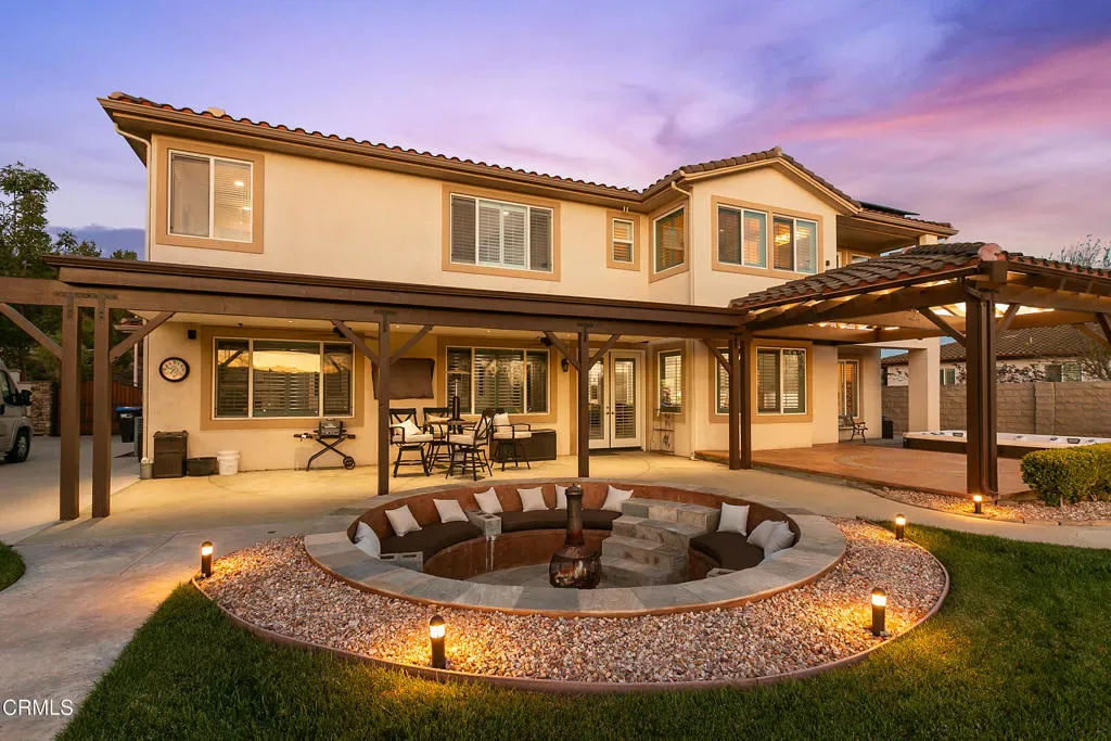 Nestled in the foothills of Moorpark Country Club within the prestigious gated community of Moorpark Country Club Estates, seamlessly combines elegance, comfort, and resort-style living. Breathtaking mountain views and overlooking a scenic 27-hole championship golf course, this beautifully remodeled, move-in-ready home offers the ultimate in luxury and lifestyle. Step into an impressive foyer highlighted by soaring ceilings and a sweeping staircase that sets the tone for the home’s refined design. The formal living and dining rooms are perfectly scaled for intimate gatherings and are enhanced by picturesque yard views that create a warm and inviting atmosphere. Adjacent to a charming breakfast nook and spacious breakfast bar, the fully remodeled kitchen showcases sleek quartz countertops, modern custom cabinetry, high-end appliances, abundant counter space, and designer finishes throughout. Thoughtfully designed for both functionality and style, the kitchen opens seamlessly to the family room, complete with beautifully crafted built-in entertainment and bar cabinetry, creating an ideal setting for both everyday living and entertaining. The flexible floor plan features a convenient downstairs bedroom with en-suite bath, ideal for guests or multigenerational living. A secondary staircase provides convenient access to the upper level, where three additional bedrooms each offer private en-suite baths, along with a luxurious junior suite and an impressive primary suite featuring expansive windows that flood the space with natural light. With five spacious bedrooms and five and one-half remodeled bathrooms, comfort and sophistication are evident at every turn. Resort-inspired outdoor living elevates this property to another level, featuring a sparkling in-ground swim spa, expansive 15-person fire pit, newly poured driveway with RV parking, and an electric vehicle hookup. There is ample space to add a sport court or full-sized pool. A whole-home generator provides added peace of mind, and the garage includes custom built-in cabinetry for exceptional storage. Fresh interior paint, plantation shutters, fully remodeled bathrooms, and curated designer touches throughout complete this exceptional offering.