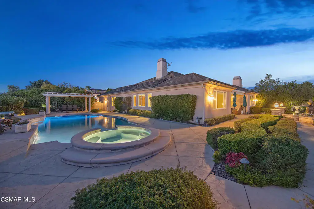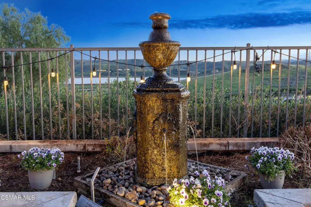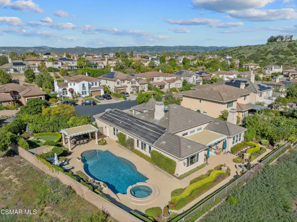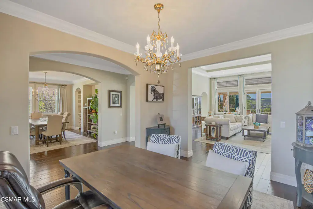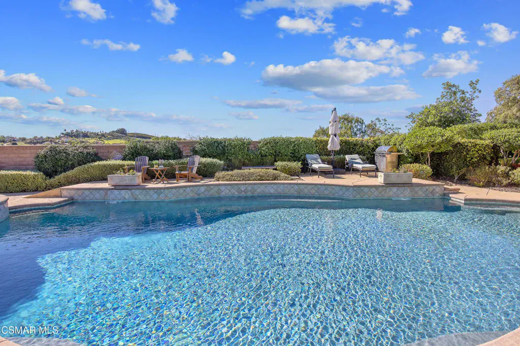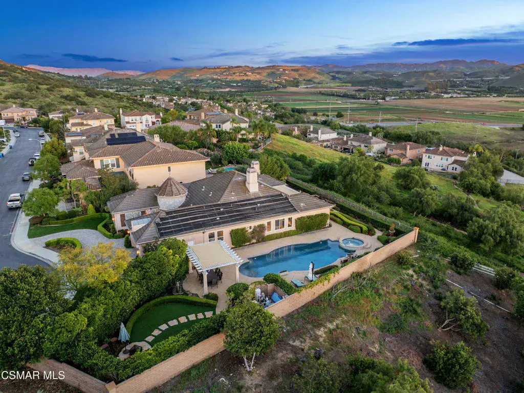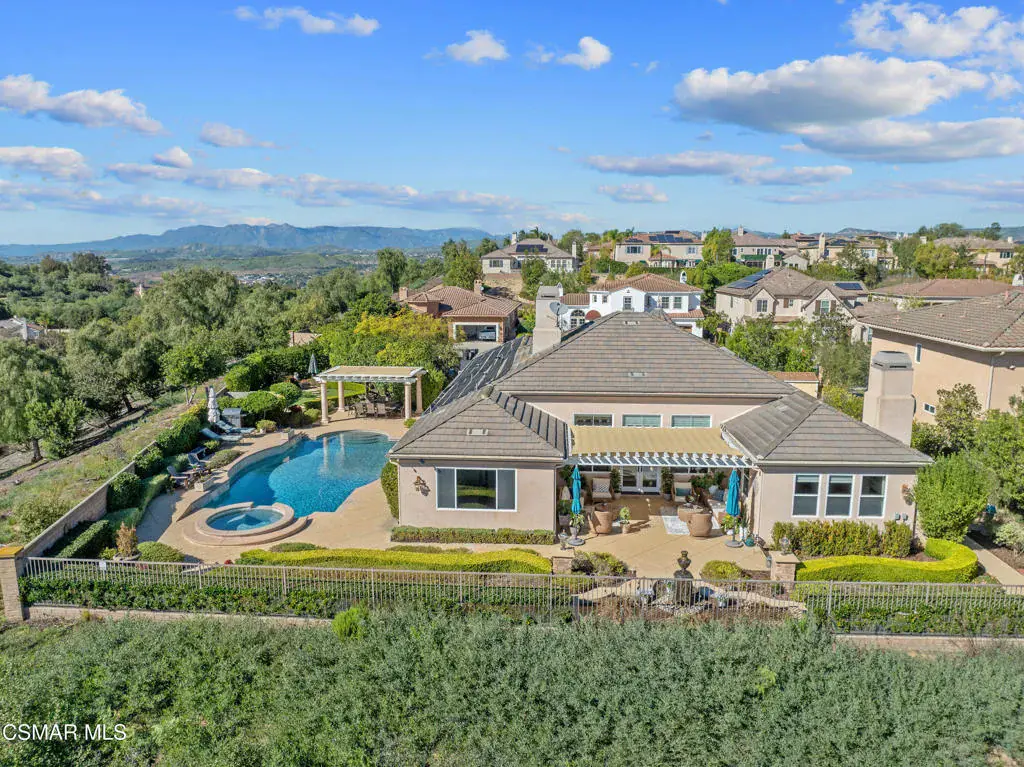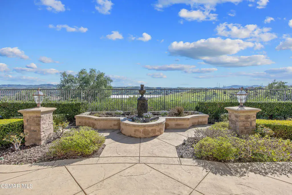 Exquisite One-Story Trieste Estate Offering Unparalleled Views and Resort Ambiance. Experience refined California living at its finest in this extraordinary single-story estate, ideally situated at the end of a desirable cul-de-sac within the prestigious Gated community of Trieste. Blending comfort, quality, and privacy, this remarkable residence captures breathtaking panoramic views of the surrounding hills and valley below while offering a true resort-style lifestyle. Set on a premium lot of nearly 15,000 square feet, this 4-bedroom, 3-bath residence spans approximately 3,420 square feet of thoughtfully designed living space. From the moment you arrive, the home’s circular driveway, manicured landscaping, and impressive curb appeal set the tone for the quality and care found throughout. The interior showcases richly hued hardwood floors, custom cabinetry throughout, and dramatic coffered ceilings creating a warm, inviting atmosphere with exceptional craftsmanship. The open, flowing floor plan is filled with natural light and highlights expansive valley and mountain views from nearly every room. The gourmet kitchen is a chef’s dream, featuring a Wolf 6-burner stove with griddle, beautiful stone backsplash, built-in refrigerator, wine refrigerator, oversized center dining island, a built-in desk, and abundant custom cabinetry, seamlessly open with a spacious informal dining area. The adjoining family room, complete with a fireplace, invites both effortless entertaining and everyday comfort. The living room also features a fireplace and refined architectural details, while the large formal dining room is ideal for hosting memorable gatherings. A charming open niche provides a flexible space perfect as an office, library, music room, reading retreat, or creative studio. Bedrooms #1 and #2 share a connected bathroom and offer exceptional versatility – you can easily imagine a mother-in-law private bedroom and den. The primary suite is a peaceful retreat, offering his and hers separate vanities, a dual-head shower, soaking tub, and a huge walk-in closet with custom built-in cabinetry, shoe racks, and drawers. The in-house laundry room includes a utility sink and ample storage. The finished garage features epoxy-coated flooring and extensive custom built-in storage cabinetry with drawers, cabinets, and countertops, offering both practicality and organization. Additional highlight include dual-zone air conditioning for optimal year-round comfort. Step outside to an entertainer’s paradise where multiple outdoor seating and dining areas create endless opportunities for relaxation and gathering. A covered pergola provides an inviting outdoor dining space, while a sprawling covered lounge patio frames the private, lush backyard. The solar heated saltwater pool and spa invite year-round enjoyment, while garden pathways wind through mature landscaping and multiple fruit trees. One path leads to a tranquil serenity garden with fountain, a peaceful sanctuary surrounded by greenery–perfect for reflection, yoga, or unwinding in nature. This is a rare offering in one of the area’s most sought-after communities, an exceptional Trieste estate exemplifying comfort, privacy, and the art of fine living.