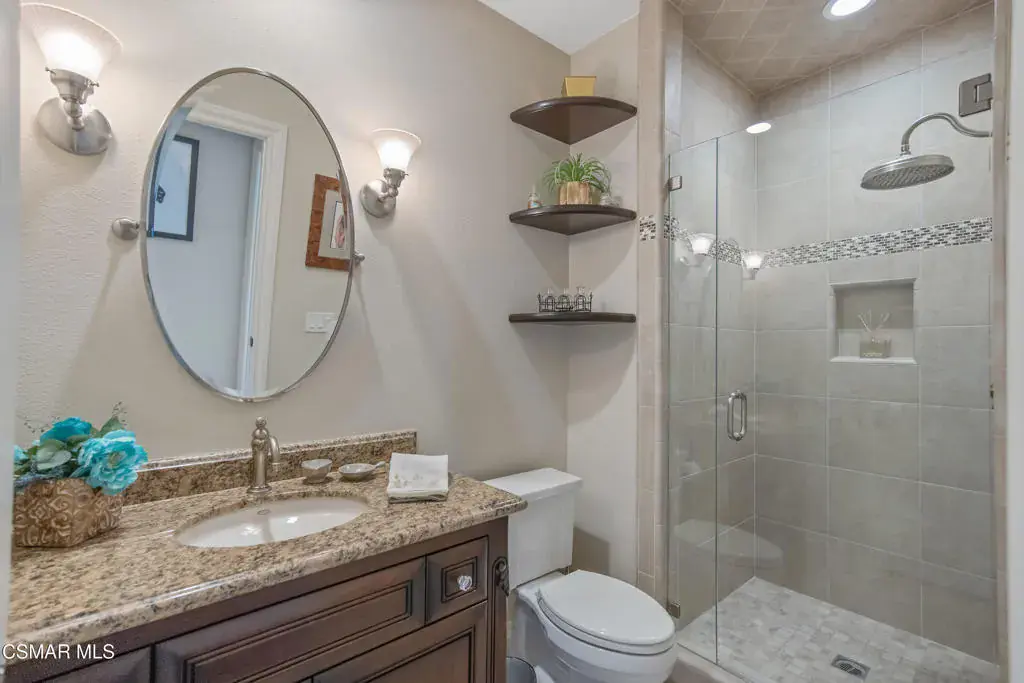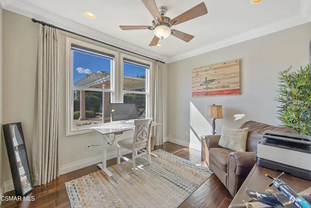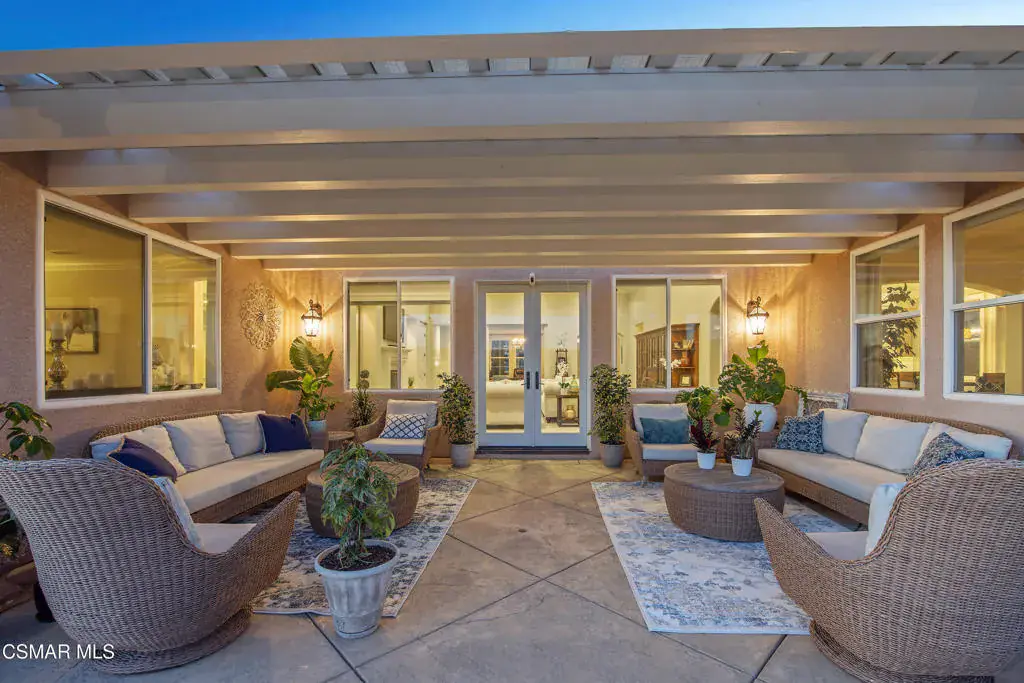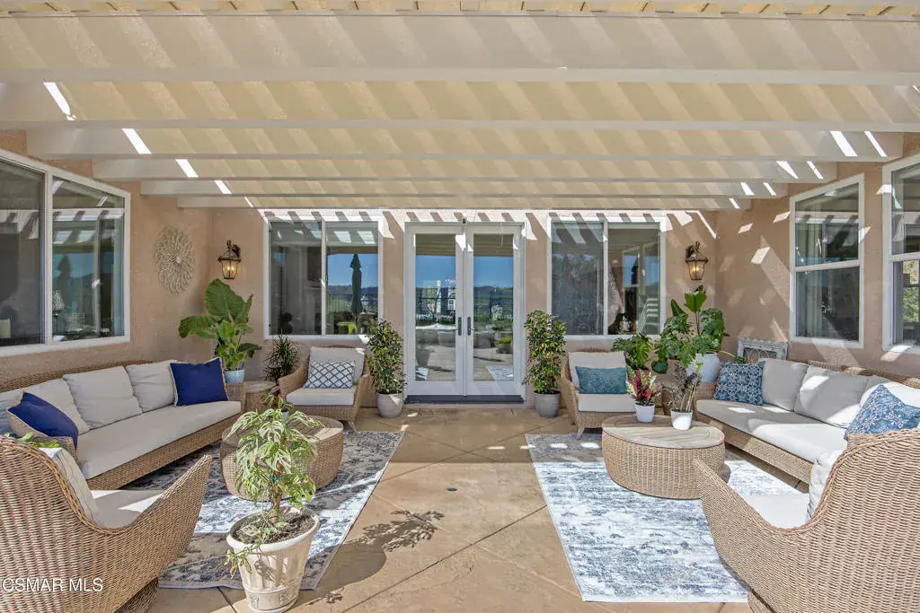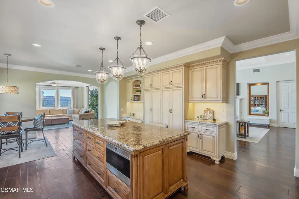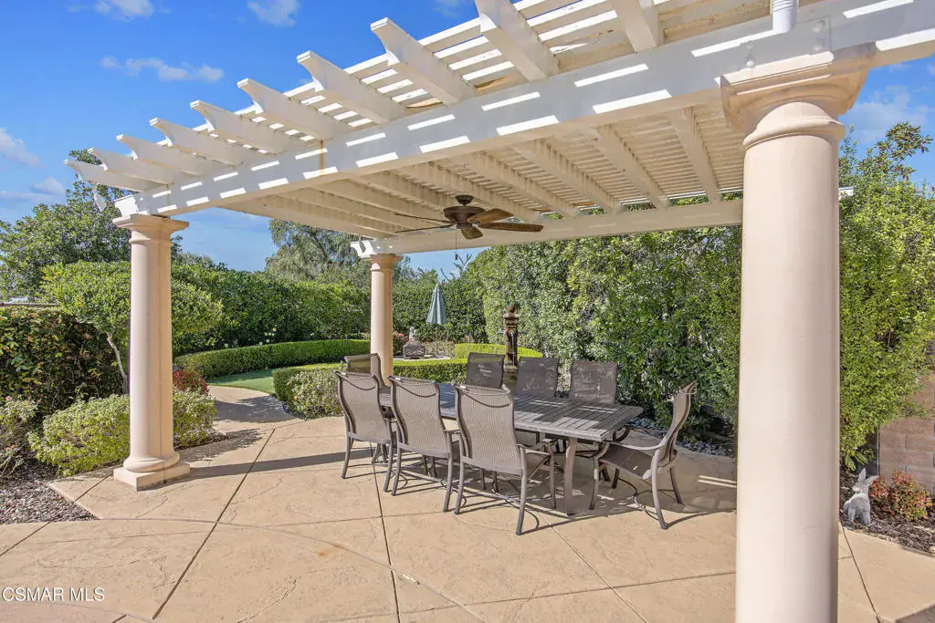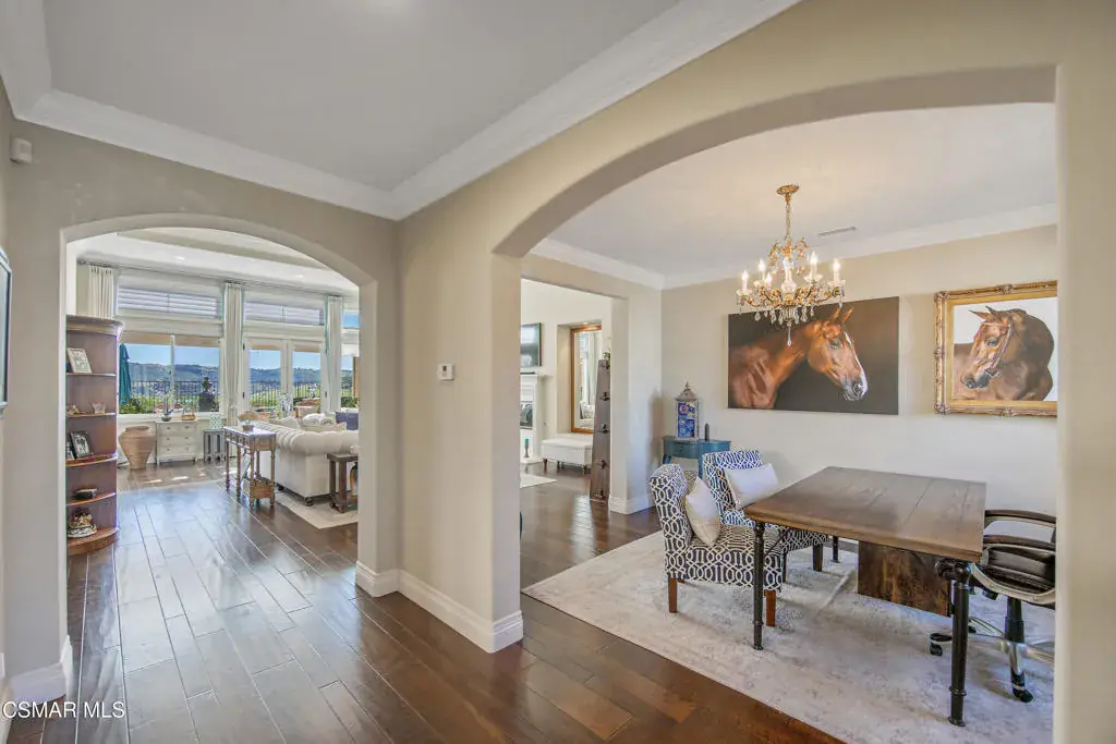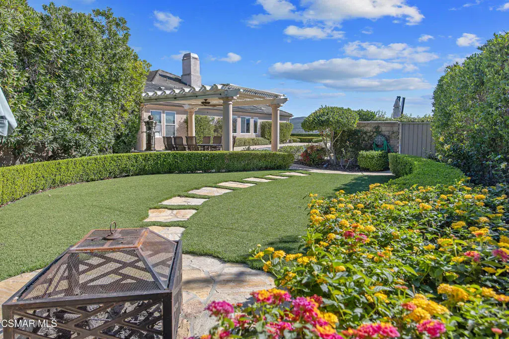 Exquisite One-Story Trieste Estate Offering Unparalleled Views and Resort Ambiance. Experience refined California living at its finest in this extraordinary single-story estate, ideally situated at the end of a desirable cul-de-sac within the prestigious Gated community of Trieste. Blending comfort, quality, and privacy, this remarkable residence captures breathtaking panoramic views of the surrounding hills and valley below while offering a true resort-style lifestyle. Set on a premium lot of nearly 15,000 square feet, this 4-bedroom, 3-bath residence spans approximately 3,420 square feet of thoughtfully designed living space. From the moment you arrive, the home’s circular driveway, manicured landscaping, and impressive curb appeal set the tone for the quality and care found throughout. The interior showcases richly hued hardwood floors, custom cabinetry throughout, and dramatic coffered ceilings creating a warm, inviting atmosphere with exceptional craftsmanship. The open, flowing floor plan is filled with natural light and highlights expansive valley and mountain views from nearly every room. The gourmet kitchen is a chef’s dream, featuring a Wolf 6-burner stove with griddle, beautiful stone backsplash, built-in refrigerator, wine refrigerator, oversized center dining island, a built-in desk, and abundant custom cabinetry, seamlessly open with a spacious informal dining area. The adjoining family room, complete with a fireplace, invites both effortless entertaining and everyday comfort. The living room also features a fireplace and refined architectural details, while the large formal dining room is ideal for hosting memorable gatherings. A charming open niche provides a flexible space perfect as an office, library, music room, reading retreat, or creative studio. Bedrooms #1 and #2 share a connected bathroom and offer exceptional versatility – you can easily imagine a mother-in-law private bedroom and den. The primary suite is a peaceful retreat, offering his and hers separate vanities, a dual-head shower, soaking tub, and a huge walk-in closet with custom built-in cabinetry, shoe racks, and drawers. The in-house laundry room includes a utility sink and ample storage. The finished garage features epoxy-coated flooring and extensive custom built-in storage cabinetry with drawers, cabinets, and countertops, offering both practicality and organization. Additional highlight include dual-zone air conditioning for optimal year-round comfort. Step outside to an entertainer’s paradise where multiple outdoor seating and dining areas create endless opportunities for relaxation and gathering. A covered pergola provides an inviting outdoor dining space, while a sprawling covered lounge patio frames the private, lush backyard. The solar heated saltwater pool and spa invite year-round enjoyment, while garden pathways wind through mature landscaping and multiple fruit trees. One path leads to a tranquil serenity garden with fountain, a peaceful sanctuary surrounded by greenery–perfect for reflection, yoga, or unwinding in nature. This is a rare offering in one of the area’s most sought-after communities, an exceptional Trieste estate exemplifying comfort, privacy, and the art of fine living.