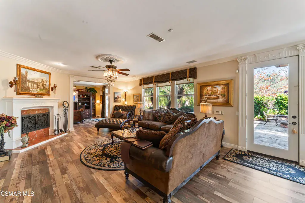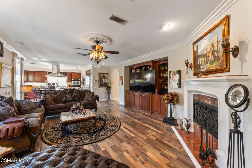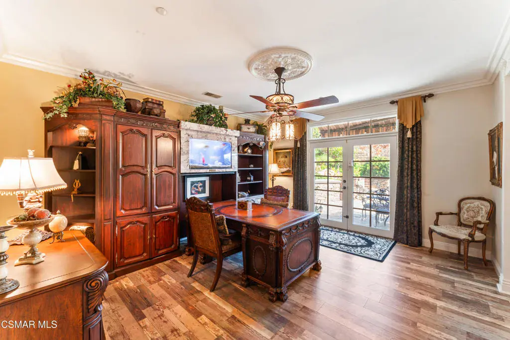 Freshly painted interior move-in ready with a $126,000 price reduction. From the moment you enter this prestigious gated community of Serenata / Trieste tract. and step through a custom iron front door into the dramatic foyer. You will be dazzled by the detailed craftmanship with no expenses spared. You are greeted with 2 formal sitting areas, one with a built-in wet bar for hosting the best parties. The other, a living room has a cozy fireplace surround. The arched hallway opens up to a vaulted ceiling with an adjacent walk-in temperature-controlled wine cellar, powder bathroom for guests, and a view of a private water featured courtyard. As you flow into the formal dining room, perfect setting for your special events it’s as elegant as it gets. A large butler’s pantry connects into the chef’s gourmet kitchen which features a massive, hooded center island, breakfast bar with all stainless-steel high-end appliances, granite countertops and a large eat-in area. The family room is an open concept where you can entertain your guest and gather around the fireplace. In front of a built-in theater entertainment center with 2 large adjoining rooms. The laundry room has a countertop and plenty of cabinets for storage. From there you can walk out into the two-car finished garage with built in cabinetry and a third car tandem space 123 Sq Ft ”not included” in total square footage of home This has been converted into office/maid quarters. The second level features a large landing with 5 spacious bedrooms, including a magnificent primary suite breathtaking view of the Regan Library across rolling hills. The ensuite bathroom includes a jacuzzi soak tub and step-in shower with 2 resting benches. There are also His and Hers walk-in cedar lined closets with custom cabinet units. The back yard is breathtaking, stunning and perfect for entertaining. It has all to offer including an auxiliary solar heated pool/spa, built- in barbeque, fire pit, Pizza oven. Koi pond with waterfall, a cabana with fans misters, heat lamps, and lastly, a retractable awning for outside dinning and shade. That’s right it has it all! This home offers approximately 4,777 square feet. five bedrooms, five bathrooms and the luxurious open floor plan feature high 9-12-foot ceilings with crown moldings. There is also custom millwork throughout including solid interior doors, custom cabinetry, window coverings, natural stone, marble, wood flooring throughout and extensive hard scape. With immediate and future savings in mind, there’s an owned Solar System with back up battery This is magnificent well-maintained home with low HOA dues, easy access to freeways. convenient shopping, beautiful parks and walking trails.