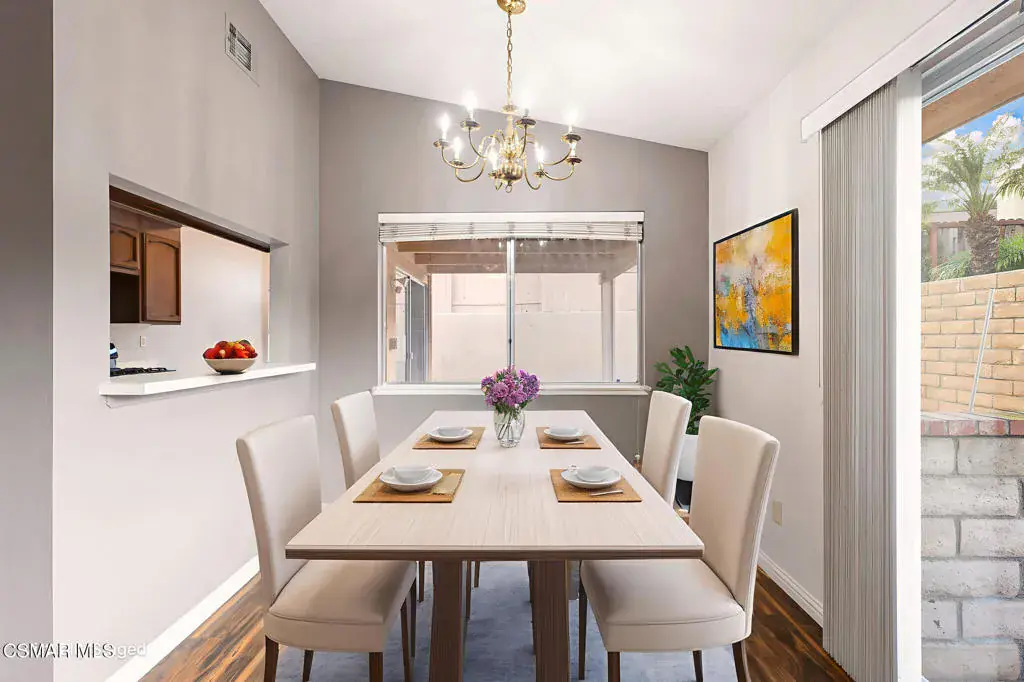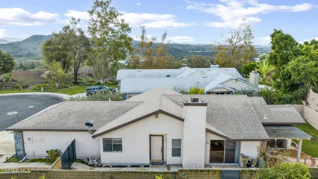 Set on a hilltop cul-de-sac, this single-story Varsity Park Patio Home welcomes you with a lush front lawn, stone-accented garage, and a brick-lined walkway leading to a gated courtyard entry. Inside, wood-like laminate flooring flows seamlessly throughout, creating a unified backdrop for the home’s light and open layout. The living room features vaulted ceilings, solar tubes, and a tile-accented fireplace, with a slider offering views of the courtyard. Just off the living room, the dining area includes a pass-through to the kitchen, making everyday meals and entertaining convenient. The galley-style kitchen includes dark cabinetry, Formica countertops, an etched-glass window, black appliances, and a breakfast nook with a slider that opens to the backyard. In the primary suite, two closets, including a walk-in with built-in cabinetry–provide ample storage. A slider opens to a patio area, extending the space for quiet mornings or relaxed evenings. The en-suite bathroom features a dual-sink vanity and an oversized walk-in shower. The hall bathroom includes an updated vanity, modern lighting, and a reglazed tub/shower combination. Both bathrooms offer newer dual shower heads with handheld options. Two secondary bedrooms include ceiling fans and closet storage, with one offering access to the patio area. A linen cabinet and hall closet add additional storage in the hallway. An indoor laundry area with storage cabinetry and a newer LG washer and dryer adds daily convenience. Other improvements include paid solar, a newer water heater, furnace, AC compressor, and a newer garage door opener. The backyard features a lawn area and an in-ground spa, creating a flexible outdoor space to enjoy. Offering single-story comfort, useful updates, and convenient access to nearby amenities, this home stands out as a great Moorpark opportunity.