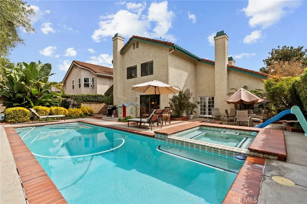 Two story, 4BD/3BA home (approx. 2,700 sq ft), 3-car garage, and private pool/spa in a quiet, low-traffic, family friendly neighborhood. Spacious layout includes a formal living room with 20-ft cathedral ceilings, floor-to-ceiling used brick fireplace, large formal dining, and a family room with wet bar & 2nd fireplace. Granite tile kitchen with decorative bullnose trim opens to the family room—both with access to a terraced backyard featuring a pool, spa, retaining wall, and mature landscaping. Upstairs: primary suite with sitting area, 3rd fireplace, large walk-in closet, and dual-sink bath with oversized shower. 3 add’l bedrooms + full bath + upstairs laundry room. Parquet floors in entry and main walkways, carpet in living areas. HOA $170/mo incl. front yard maintenance & community pool. Schools, parks, shopping, and freeway access all nearby. See 4th of July fireworks from your own backyard! Quiet neighborhood with excellent walkability and no through traffic.