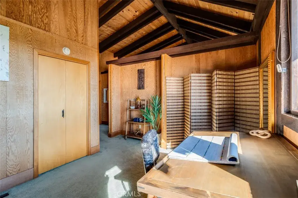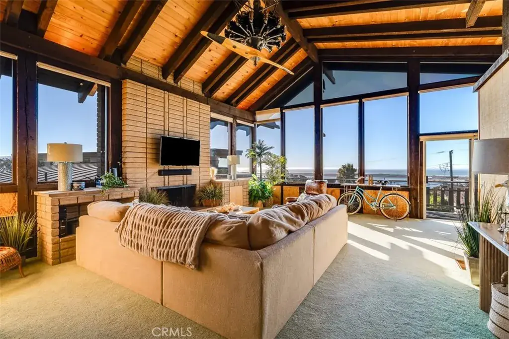 The thoughtfully designed floor plan showcases open, light-filled living spaces with expansive windows framing breathtaking views from nearly every room. The main living area features clean architectural lines, warm wood accents, and a seamless flow to an ocean-view deck ideal for relaxing or entertaining against the backdrop of Morro Bay’s ever-changing scenery. A striking centerpiece of the living space is a custom Stearman Navy trainer propeller fan, an artful nod to both craftsmanship and aviation history, adding a unique touch of character and distinction.