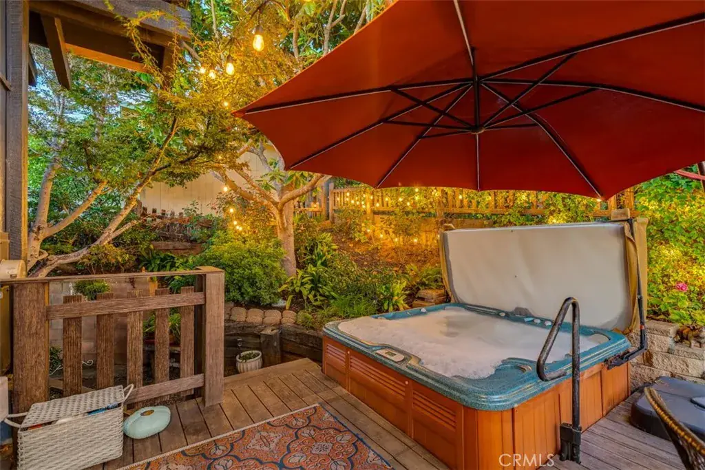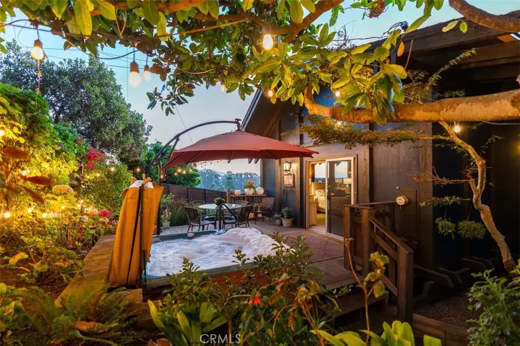 Outside, the home is surrounded by meticulously landscaped gardens, front and back, designed for privacy and serenity. The backyard features a hot tub in a secluded, beautifully landscaped setting, surrounded by mature fruit trees that enhance the sense of lush coastal living.