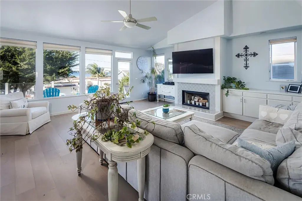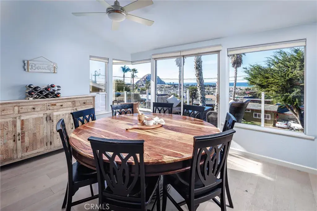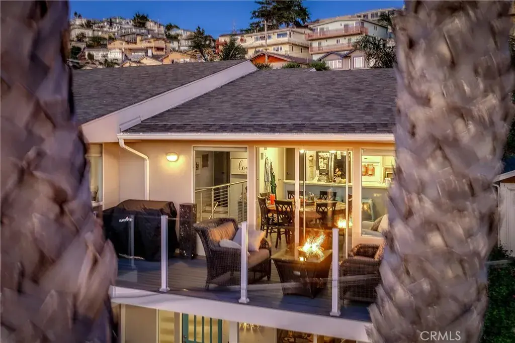 The entry level offers two generously sized bedrooms, a versatile bonus room ideal for a home office or media space, a full bathroom with tub/shower combination, and a conveniently located laundry closet. Upstairs, the expansive great room is designed for elevated living and entertaining, showcasing a cozy fireplace and seamless flow into the dining area and kitchen. Glass doors from both spaces open to an ocean-view deck where unforgettable sunsets and Morro Rock provide a spectacular backdrop.