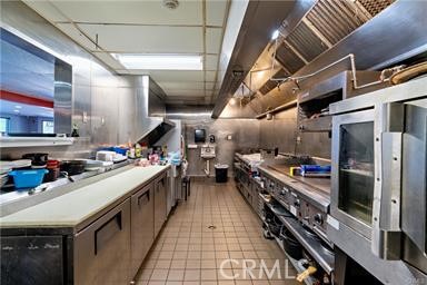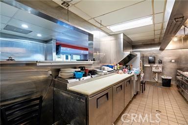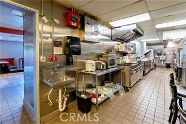 The spacious, well-equipped kitchen includes three refrigerators, an 8′ x 11′ walk-in freezer, an 8′ x 14′ walk-in refrigerator, grill, warmers, cold station, multiple sinks, a 12′ x 20′ dry storage room, and abundant additional storage throughout.