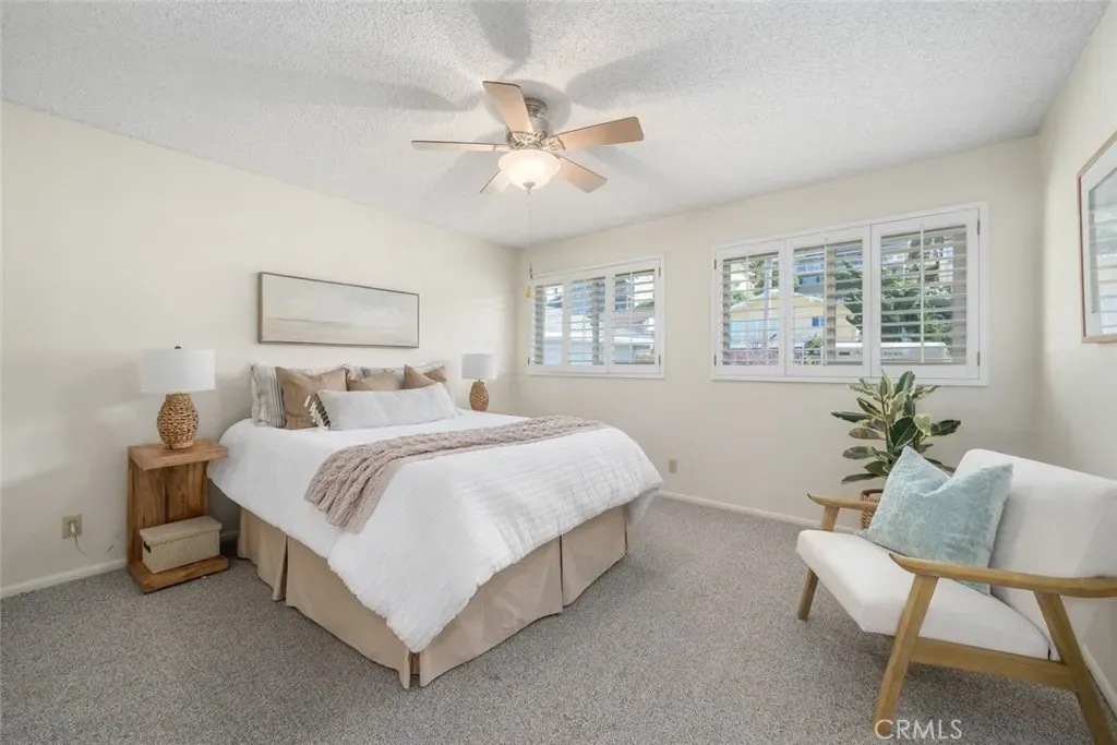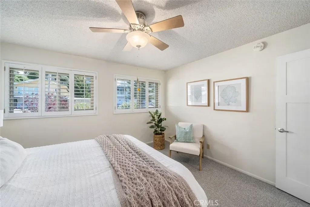 The upstairs primary suite offers a peaceful retreat with direct access to the ocean-view deck. The ensuite bath includes a dual-sink vanity and walk-in tile shower. Two additional bedrooms with plantation shutters and a full bath featuring a tub/shower with tile surround complete the main level.