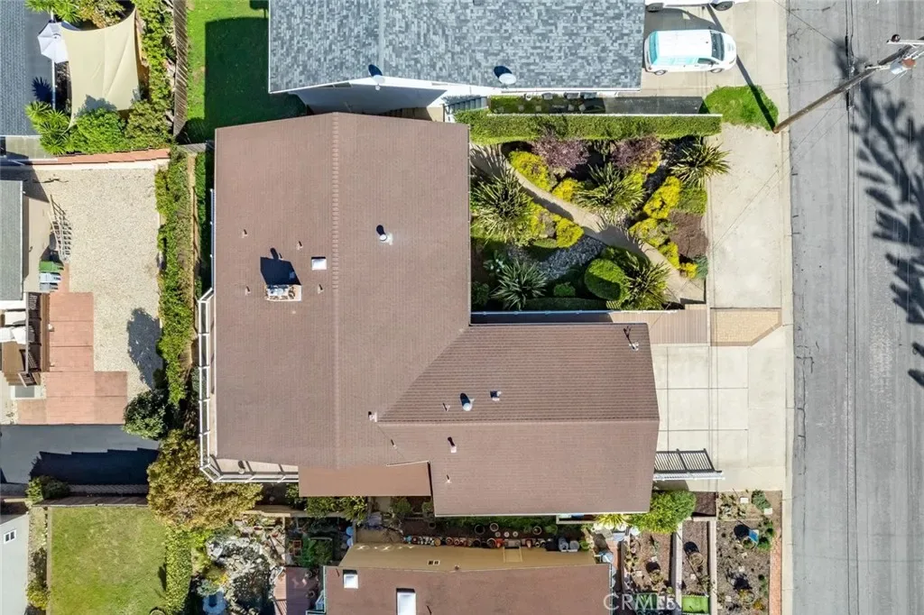 The front yard features neatly manicured landscaping, and a side walkway provides convenient access to the guest quarters. A spiral staircase from the upstairs deck leads down to a beautifully landscaped backyard.