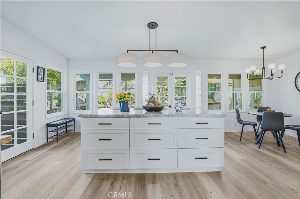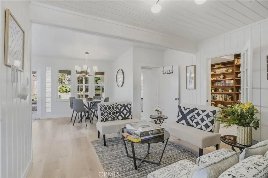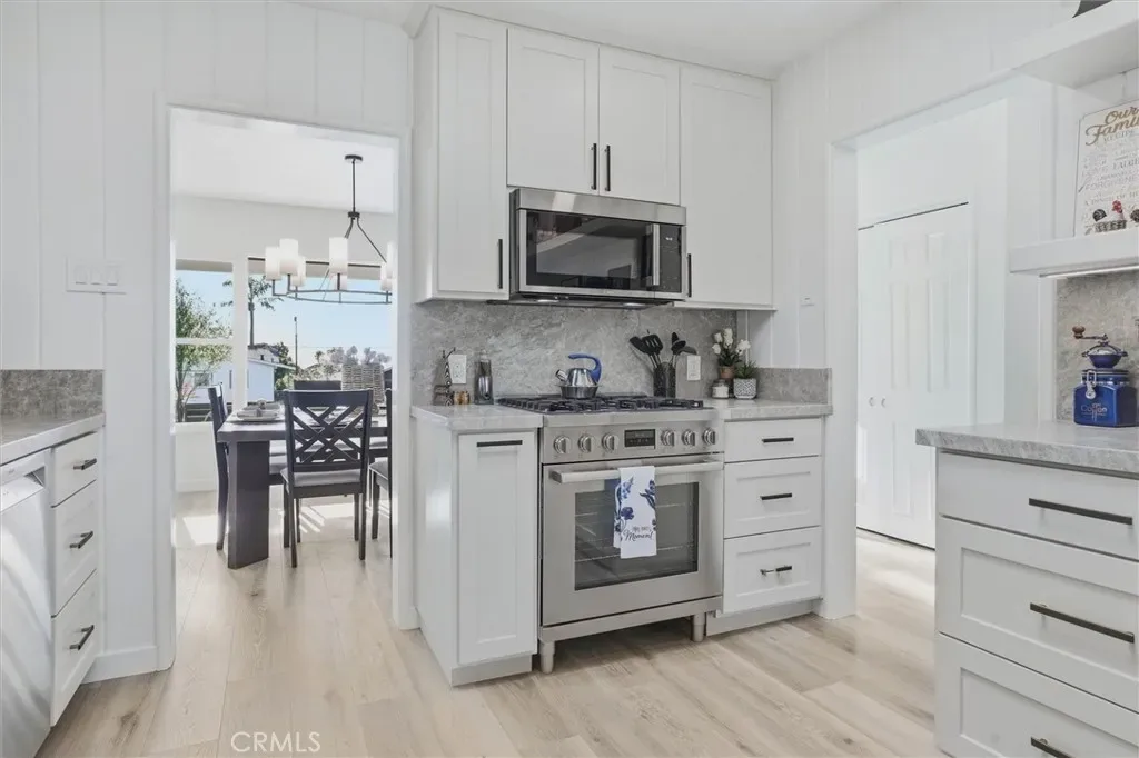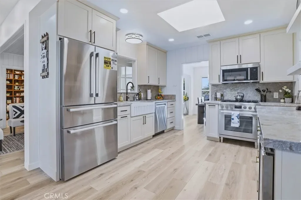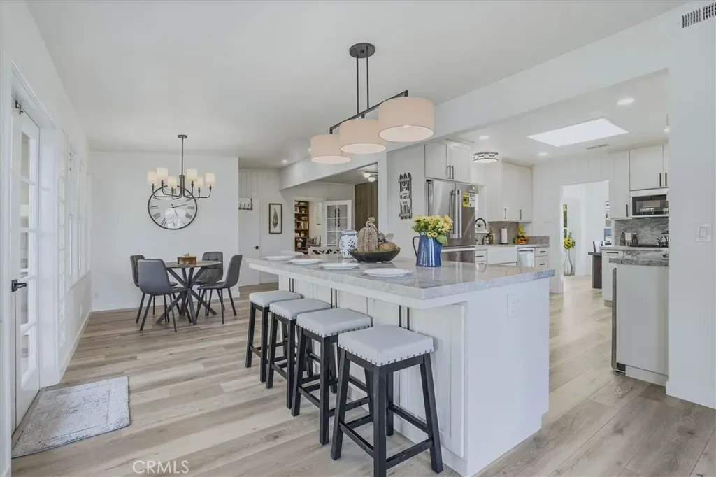 This home has been updated from top to bottom in the popular Modern Farmhouse style, blending seamlessly with preserved original character and high-end upgrades throughout. New flooring, lighting, Milgard windows, plumbing, and electrical create a fresh, move-in ready home. The kitchen combines style and function with custom Mastercraft cabinetry, a full Bosch appliance suite, huge island with Taj Mahal Quartzite counters throughout, and a skylight that fills the space with amazing natural light, opening into the breakfast nook for casual dining and easy flow.