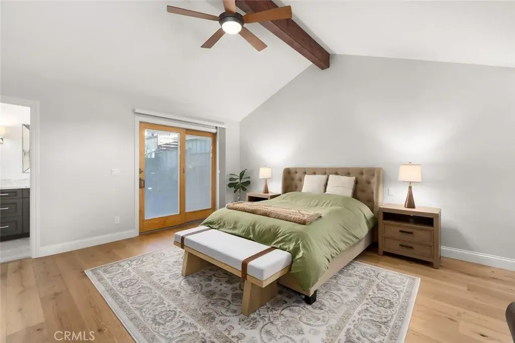 The main-level primary suite features vaulted ceilings, exposed beams, and a sitting area. The spa-inspired bath offers dual Cambria quartz counters, a soaking tub, custom tile shower, and radiant heated floors.