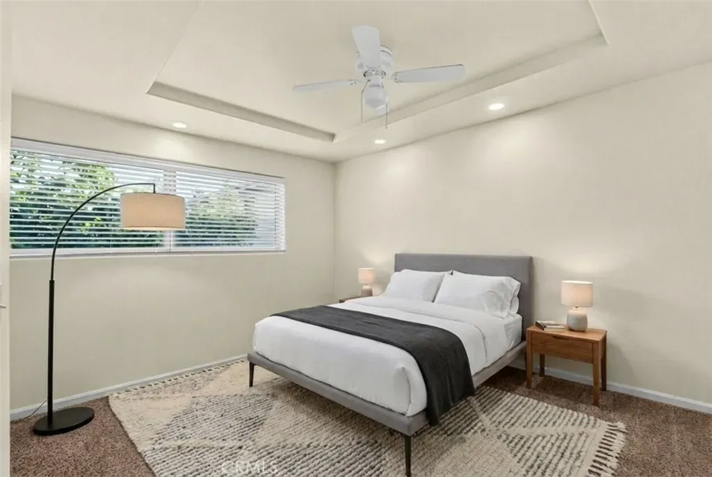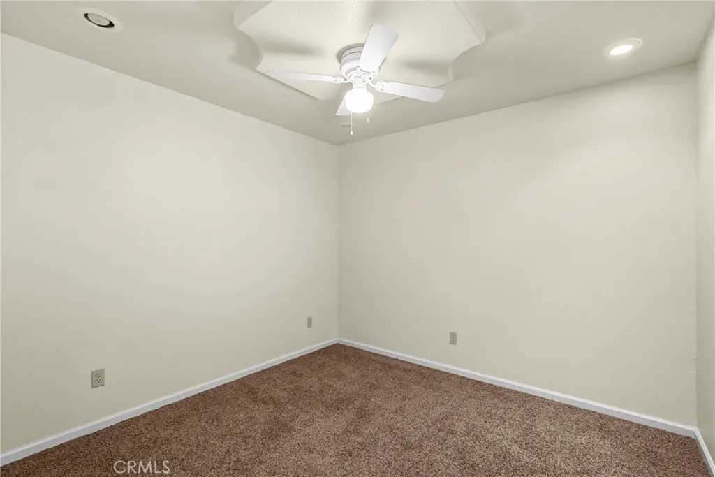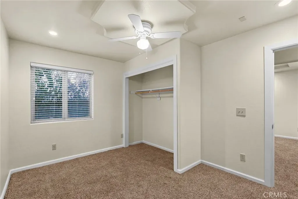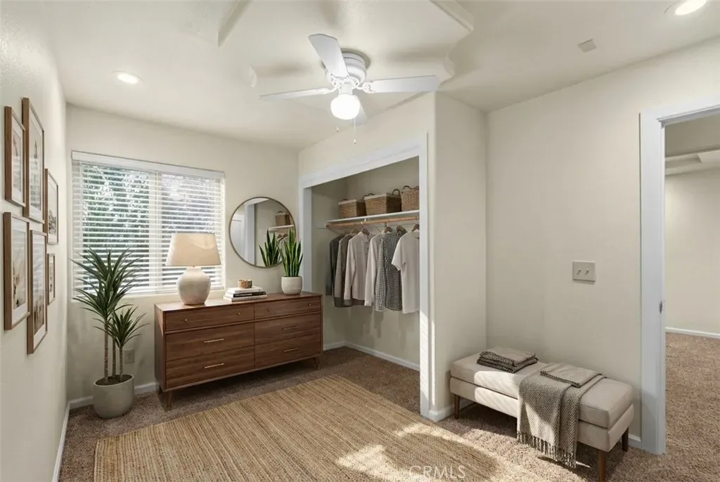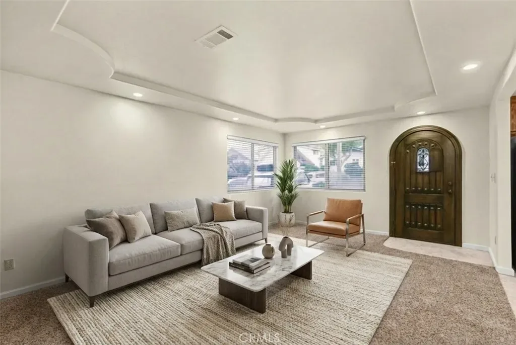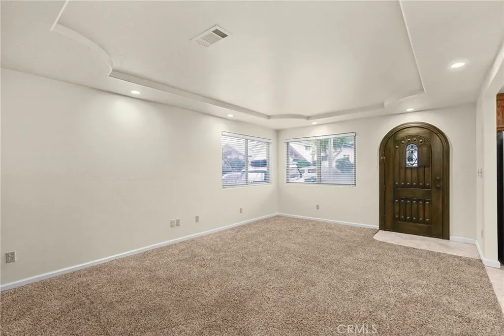 Inside, a functional layout connects the main living spaces with ease. The living room features a cozy carpeted setting with a built-in TV space, creating a comfortable place to gather. The kitchen is both practical and inviting, offering stainless steel appliances, recessed lighting, a charming bay window, and floor-to-ceiling storage. The dining area is conveniently located within the kitchen, making it perfect for both daily meals and casual entertaining.