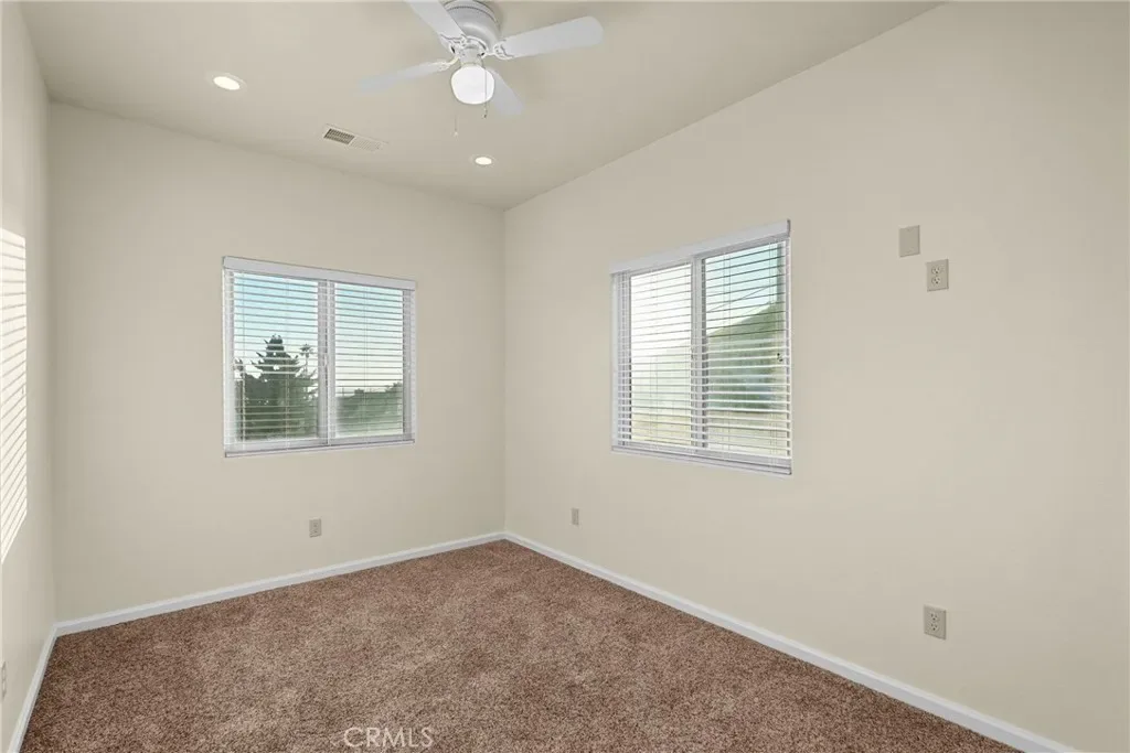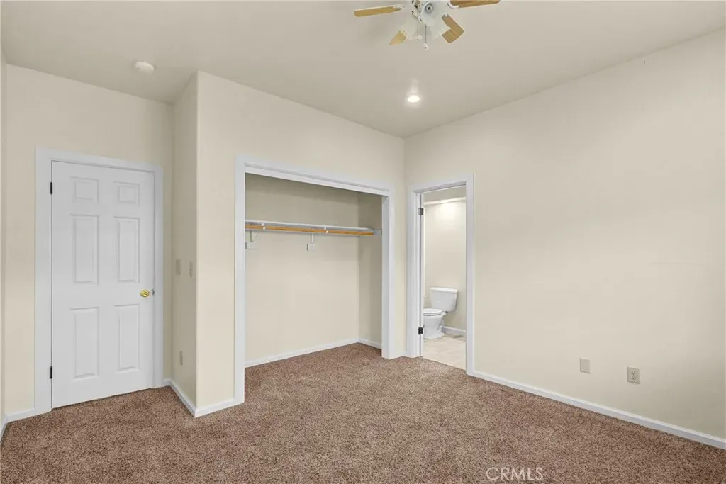 The main level includes three well-sized bedrooms, each with ceiling fans and carpet, along with a hall bathroom featuring a walk-in shower and a single vanity. Upstairs, the home expands with three additional bedrooms, including the primary suite complete with an en-suite bathroom offering a tiled shower/tub combo and single vanity with storage.