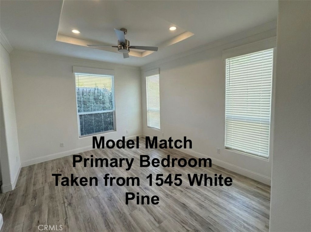 The home shown includes standout design elements such as white 54-inch flat panel upper cabinets with glass display doors, LED lighting above and below, matte black hardware, a Remedy Alchemy subway tile backsplash, and Corian Ice Staturio marble-look countertops. The kitchen includes a white farmhouse sink with a black chef’s faucet and stainless Whirlpool appliances. Throughout the home, you’ll find wide plank Cyrus Akadia laminate flooring, 9.5-foot coffered ceilings, 8-foot doors, seeded glass lighting, and black ceiling fans in every room.
