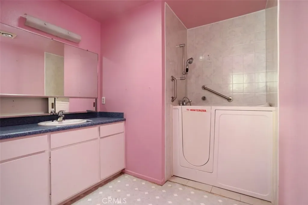 One bedroom includes a built-in bookshelf and does not have a closet. The spacious primary bedroom offers generous closet space, and the primary bathroom features a walk-in tub/shower combination.