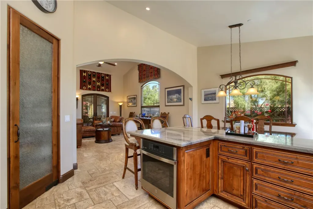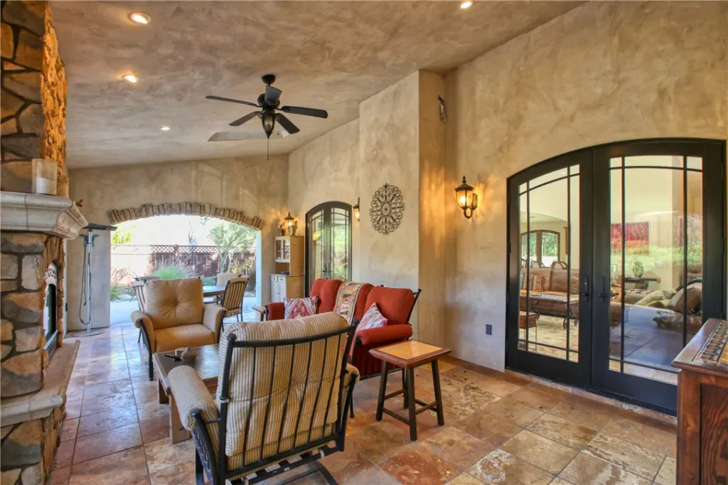 he heart of the home opens through custom 9-pane Andersen French doors to a spectacular 14’ x 28’ covered patio—an entertainer’s dream—complete with travertine floors, a gas-insert fireplace, and elegant arch-topped openings. A private, walled front courtyard offers an additional serene outdoor retreat.