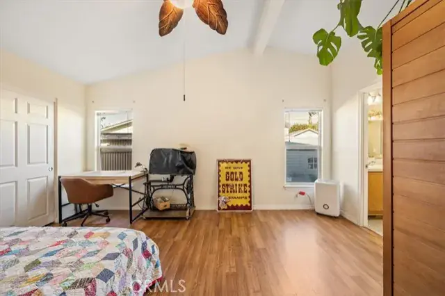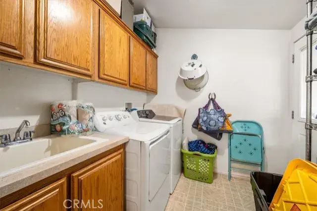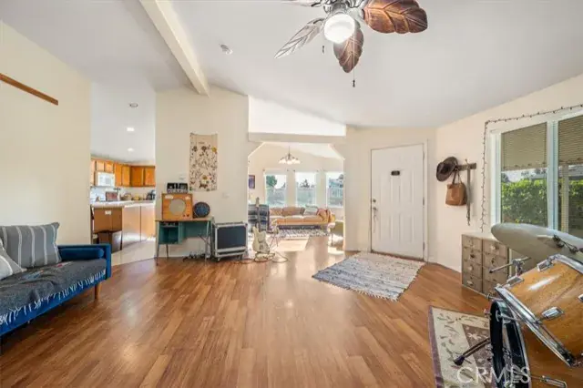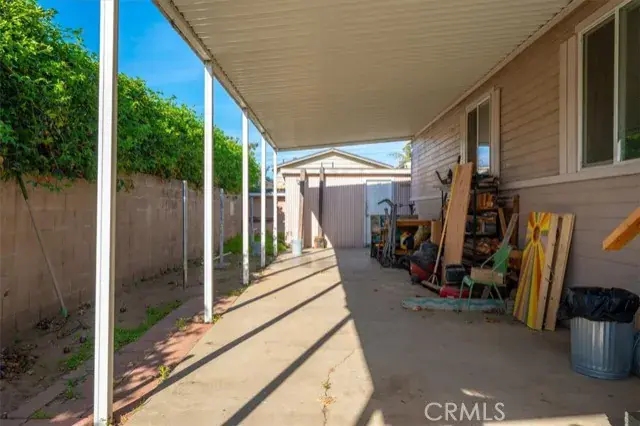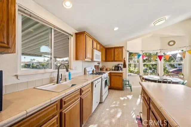 This lovely home sits on a spacious corner in the Galaxy Mobile home Park! It has skylights, high ceilings , crown molding recessed lighting and laminate hardwood floors! The large kitchen has an island, lots of cabinets and a nook. There is a separate laundry room that opens up onto a nice deck over looking the spacious yard. There is a mature lemon and lime tree that produce a lot of fruit. There are two sheds. The primary bedroom has a large closet and an ensuite bathroom with a sunken tub, separate shower and double sinks. There is a formal dining area and a nice size living room.