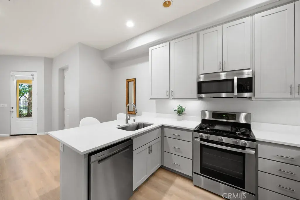 A gated front patio sets the tone as you arrive—an inviting space ideal for relaxing or entertaining. Step inside to an open-concept main level featuring high ceilings, and a bright living room with a cozy fireplace. The living area flows effortlessly into the dining space and the recently remodeled kitchen, complete with quartz countertops and new LVP flooring throughout the lower level.