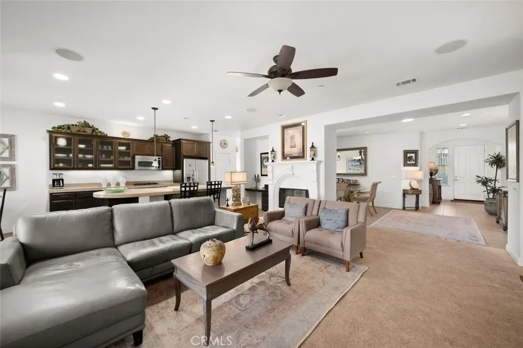 The heart of the home features an open living room and kitchen design that flows seamlessly into a spacious dining area, creating an ideal setting for both everyday living and entertaining. Natural light fills the main living spaces, enhancing the sense of openness and comfort.