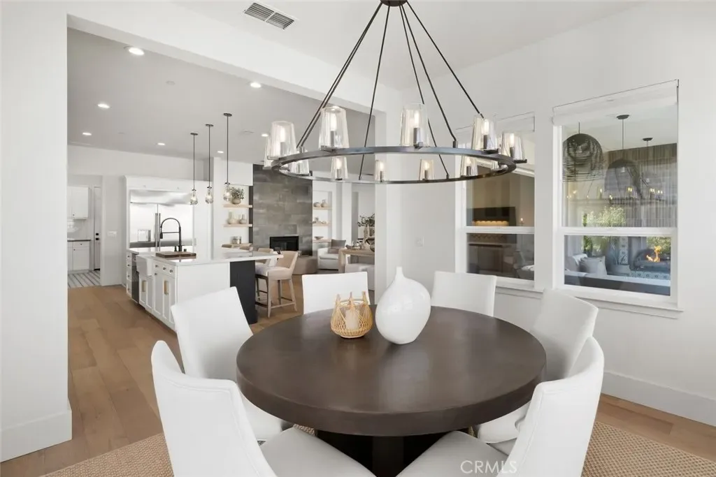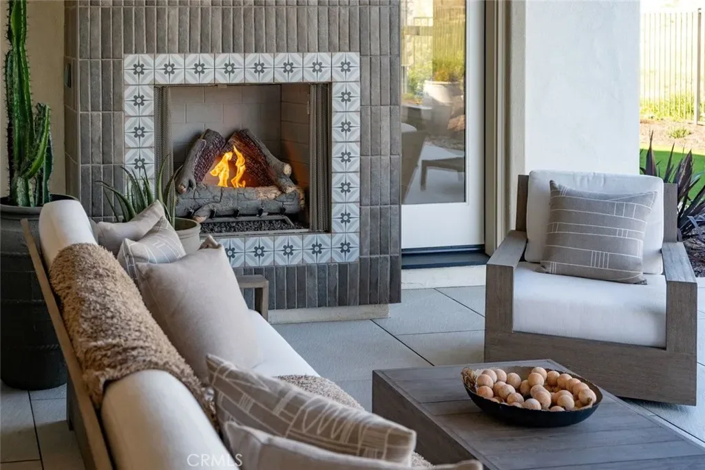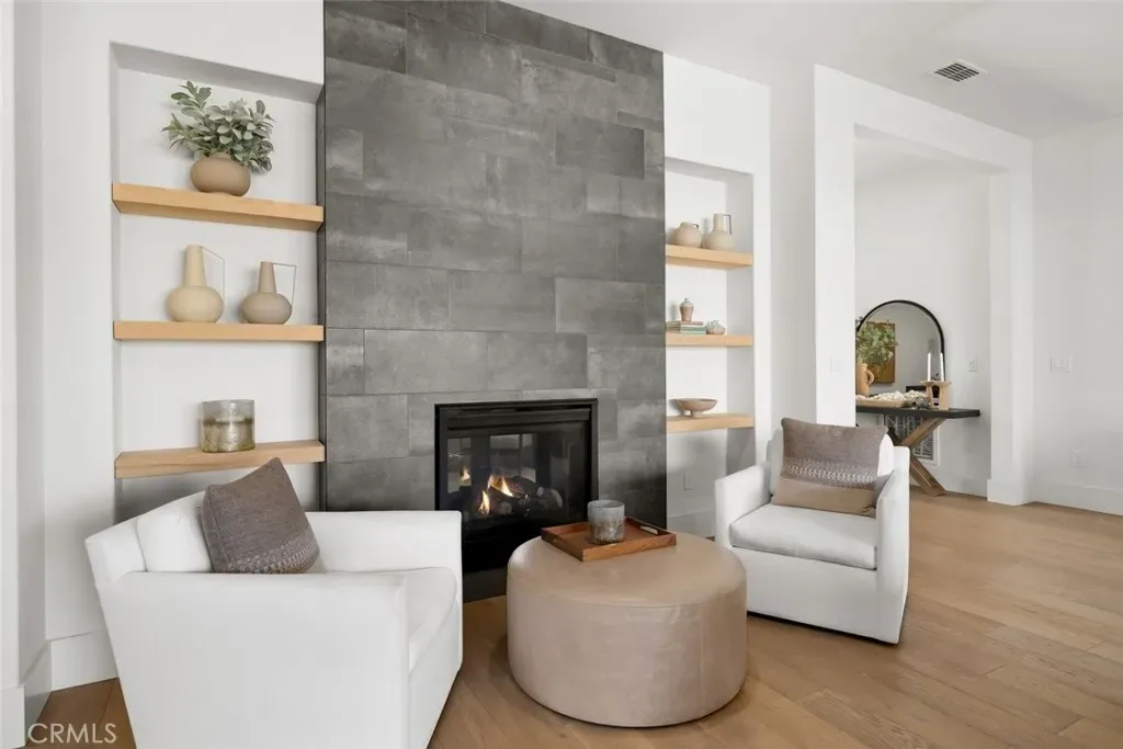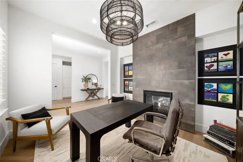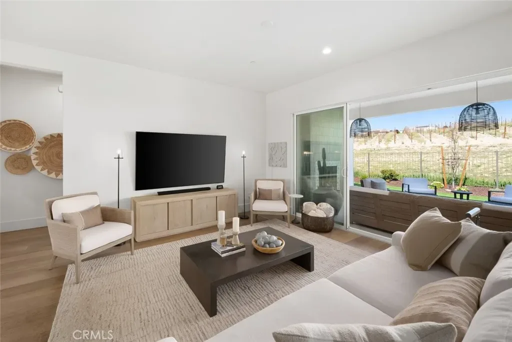 Spanning approximately 2,498± square feet, this thoughtfully designed residence offers two bedrooms, two baths, and a private office, with a layout that balances comfort and refined elegance. Beautiful white oak flooring flows throughout the main living spaces, while a striking double-sided fireplace creates a warm architectural focal point—anchoring the main living area on one side and a flexible den or office on the other. At the heart of the home, the spacious kitchen features a large center island and an adjacent dining area, ideal for both everyday living and effortless entertaining. Expansive doors open to a covered patio complete with its own fireplace, perfectly framing serene vineyard views and creating a seamless indoor-outdoor experience.