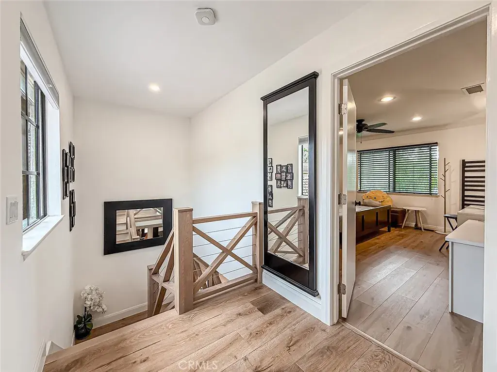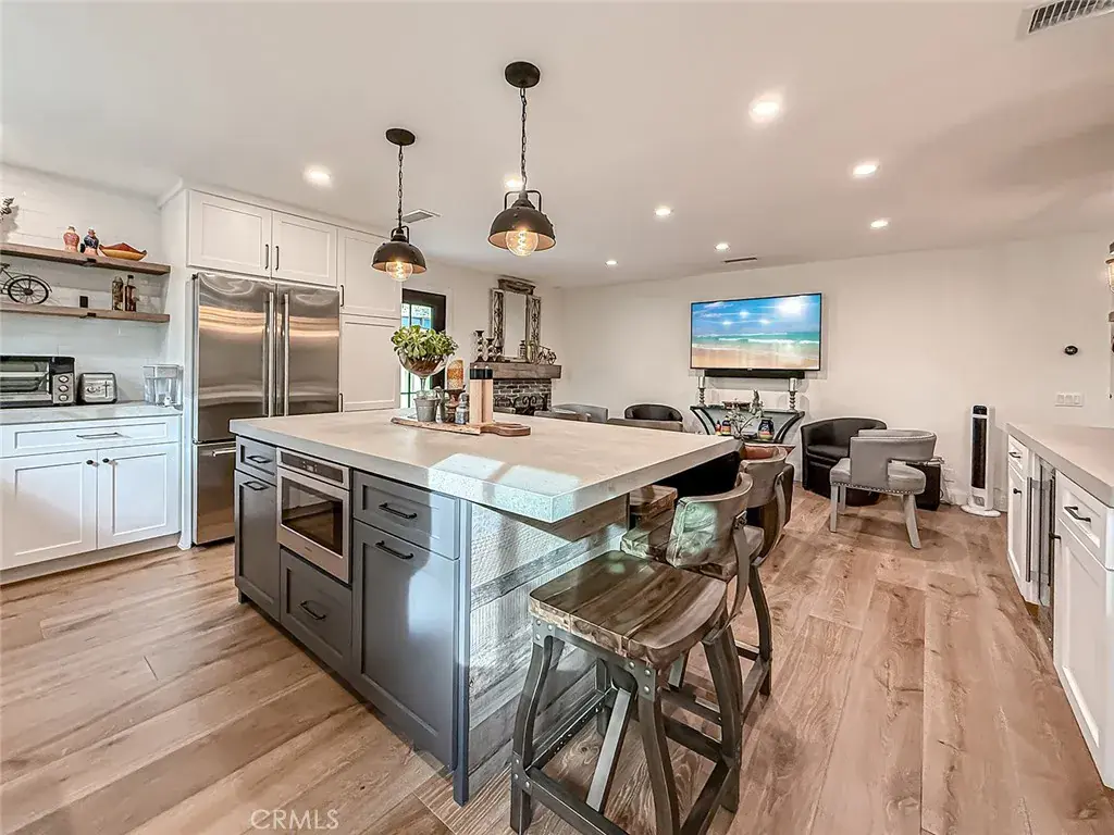 Located in a desirable cul-de-sac across from Deerhill Park, this beautifully remodeled home offers sophisticated upgrades with a modern farmhouse aesthetic. The kitchen features custom cabinetry with soft-close hardware, a large Caesarstone island, Bosch dishwasher, GE Monogram appliances, and elegant pendant lighting. Oak hardwood floors, installed in 2022, enhance the open floor plan and highlight the black vinyl windows and French doors, providing abundant natural light and scenic views. Recent improvements include updated lighting throughout, a fully renovated powder room with a barn wood vanity and farmhouse sink, a remodeled primary suite with dual closets and a modern bath, and a remodeled secondary bath. The backyard is designed for both relaxation and entertainment, featuring a fenced dog run, BBQ area, pet-friendly turf, a seating area, and a freshly painted sport court with a regulation basketball hoop. Energy efficiency is maximized with Tesla solar panels (rented at $130/month), which cover electricity needs and vehicle charging. The finished two-car garage is insulated and equipped with recessed lighting, epoxy flooring, and climate control. Situated in the acclaimed Oak Park School District and within walking distance to schools, parks, trails, and community amenities, this home combines comfort, style, and convenience in a prime location.
