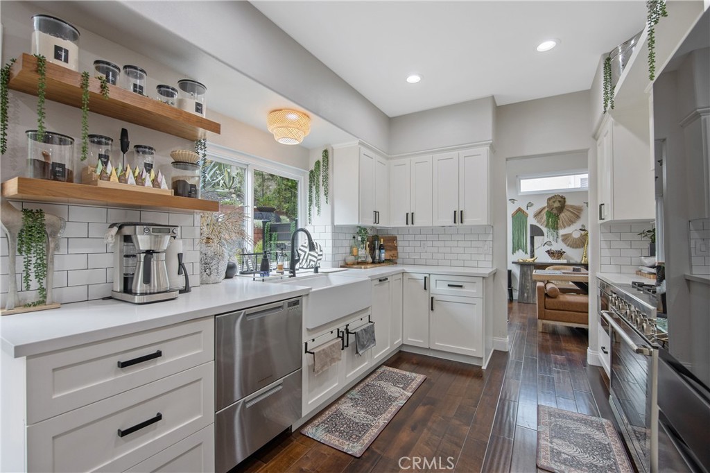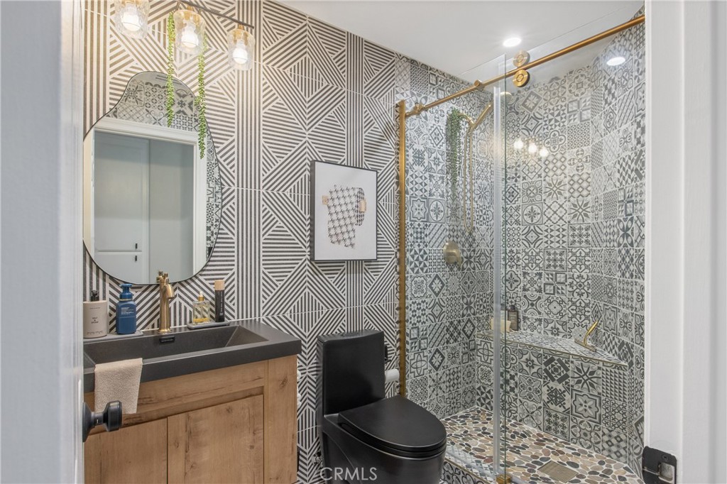 The home features quality finishes throughout, updated appliances, newer Milgard windows and sliding doors for energy efficiency and natural light, an upgraded electrical panel with EV charger, and a newer York heat pump and HVAC system. A custom laundry room sink adds everyday convenience, while the avant-garde renovated downstairs bathroom delivers a modern, design-forward touch.