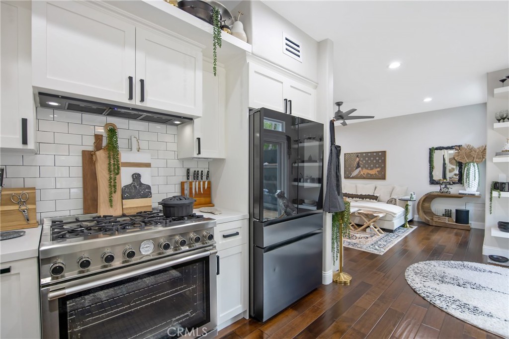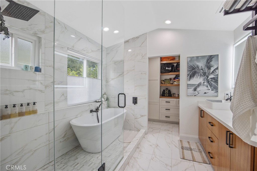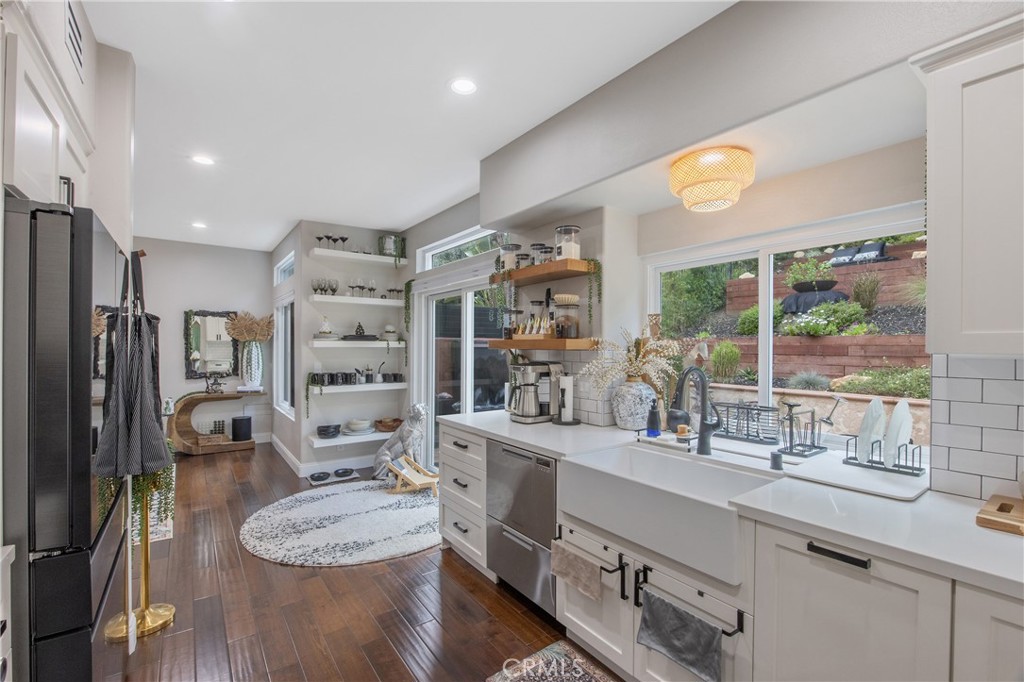The remodeled backyard offers serene sitting spaces ideal for relaxing or entertaining. The garage includes a highly insulated, smart phone-operated garage door, and the home is further enhanced by a whole-house water filtration system with mineral reducer.