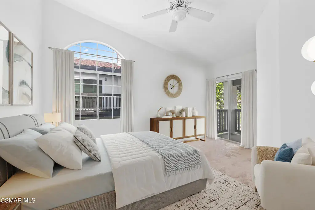 Light & cheerful end-unit featured on HGTV’s House Hunters! This Oak Park 2+2.5 townhome with private courtyard and attached garage feels more like a house. Beautiful parks and hiking trails are right outside your door, with Deerhill Park only a mile away. Living room has a cozy fireplace and lots of windows. White & bright kitchen with sliders that open to a peaceful enclosed garden featuring citrus trees, outdoor lighting, flagstone pavers and water feature. Upstairs are two separate primary bedrooms both with new carpeting, ceiling fans, walk-in closets, and en-suite full baths. Washer & Dryer are conveniently located in the 1-car attached garage with extra storage space. There is also a reserved carport space next to the garage. Quiet and lovely ”Shadow Oaks” community offers a pool, jacuzzi, clubhouse and gym. Close to highly sought after schools, Agoura Hills, and Westlake Village.