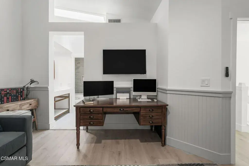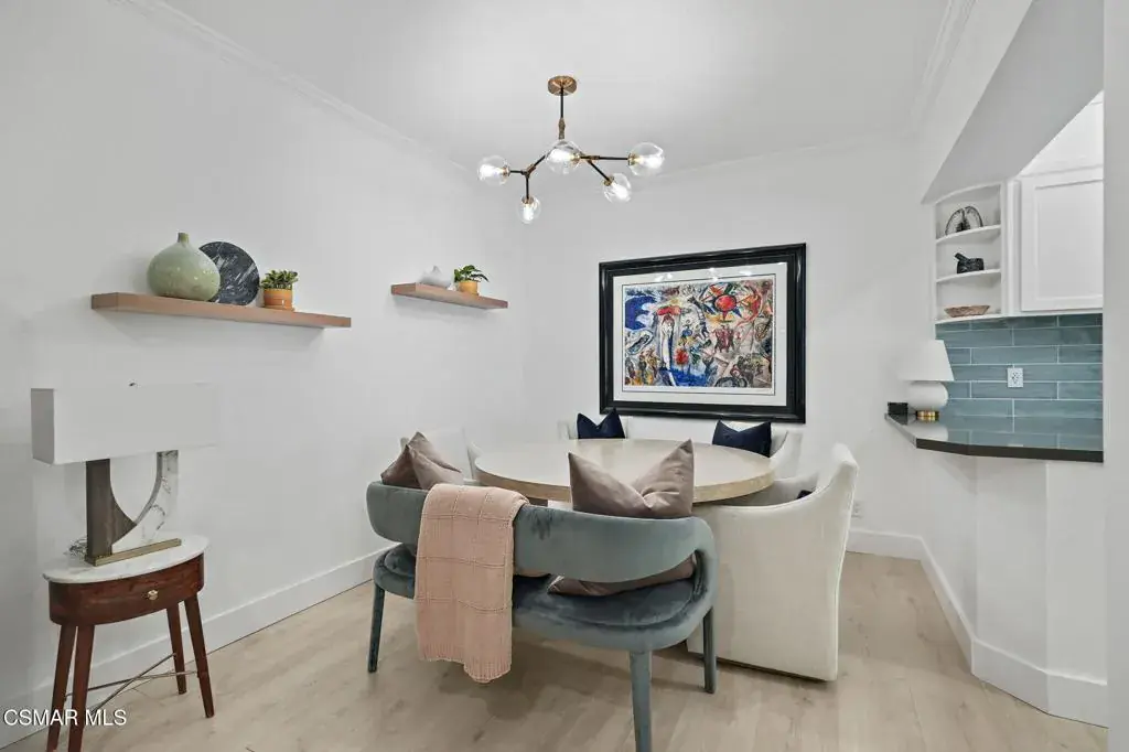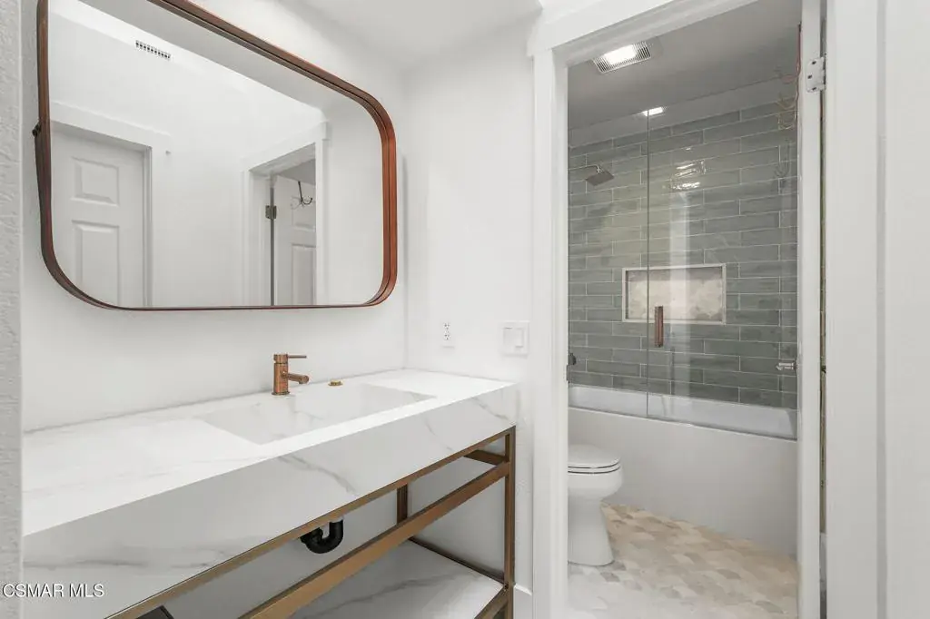 Elegantly updated in 2023, this timeless home features the following: Wide plank performance grade flooring throughout (AC6 durability rated for high traffic areas, kids, and pets!), updated dream kitchen which includes soft close cabinets/drawers, quartz countertops, chef worthy cafe line appliances with accent champagne bronze hardware finishes, oak floating shelves, polished ceramic backsplash tile, Moen sensor touch less faucet and deep under mounted kitchen sink. Directly off this designer kitchen boasts a lovely open concept dining area, living room, charming fireplace, elaborate high ceilings, recess lighting throughout, and a gorgeous, updated half bath off the main living room for your guests. Arrive at the second floor where you can find two bedrooms each with their own en suite bathrooms and custom walk-in closets. To your right walk into a vibrant primary suite equipped with large sliding glass doors that open to a private patio and nature. Enjoy a cup of coffee or a nighttime beverage while immersing yourself In all nature has to offer. Step back inside and enjoy on suite bathroom amenities featuring modern sleek vanity, champagne bronze fixtures, honed herringbone marble floors, custom shower glass doors, and a custom walk-in floor to ceiling honed marble shower that makes your private oasis feel like an exclusive luxury spa. Encompass yourself in floor to ceiling marble and enjoy the delta vero rainfall shower experience. Step outside your personal spa and enter into your custom walk-in closet featuring soft close drawers, shoe storage, bag storage, and ample clothing space. To the left of the second story landing boasts a stunning second bedroom which can be transformed for guests, office space, or a nursery. En suite second bedroom bath includes modern vanity, marble flooring, deep soaker tub, ceramic tile, delta Vero shower fixtures, and custom shower glass doors. Step outside this spa like experience and enter the second walk in closet of the house featuring soft close drawers, shoe shelving, and ample clothing space. Additional highlights include a one-car garage, smart home features and access to a community gym/exercise room for your daily workouts. For outdoor enthusiasts, enjoy the nearby hiking and biking trails, perfect for taking in the surrounding natural beauty.Centrally located between Westlake Village, Agoura, Calabasas and highly sought after school districts!This home is in the Shadow Oaks community – NOT Shadow Ridge. Conventional financing is approved.