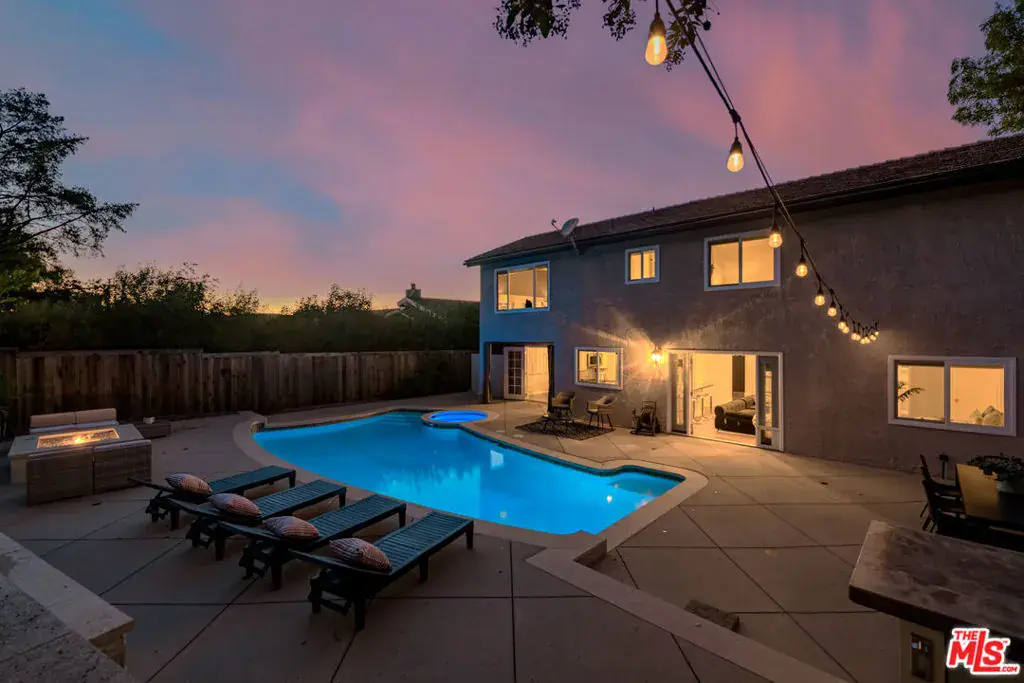 Nestled in the picturesque Oak Park community, this warm and welcoming home offers one of the most impressive backyards in the neighborhood. Set on a peaceful, tucked-away street, the property features over 2,200 square feet of thoughtfully designed living space, including four bedrooms and three bathrooms. The double-door entryway opens to a grand foyer and spacious living room, highlighted by vaulted ceilings and a stack-stone fireplace. The formal dining area features French doors that lead directly to the resort-style backyard, creating a seamless flow for indoor-outdoor living. The open-concept kitchen flows into the great room, where a second set of French doors opens to the pool, creating an ideal layout for everyday comfort and entertaining. The first floor includes a well-appointed guest bedroom and full bathroom, while upstairs you’ll find two additional guest bedrooms connected by a Jack-and-Jill bathroom. The second-floor south wing comprises only a primary suite and overlooks the idyllic backyard. The secluded backyard is the true showstopper, a resort-inspired oasis designed for year-round California living. Enjoy a sparkling pool and spa, a tranquil water feature, a built-in fire pit lounge, and a fully equipped outdoor kitchen complete with barbecue and refrigerator. Beyond the home itself, residents can take full advantage of Oak Park’s natural beauty and peaceful atmosphere, with access to scenic hiking trails, neighborhood parks and award-winning schools, and the lush, picturesque landscapes the community is beloved for.