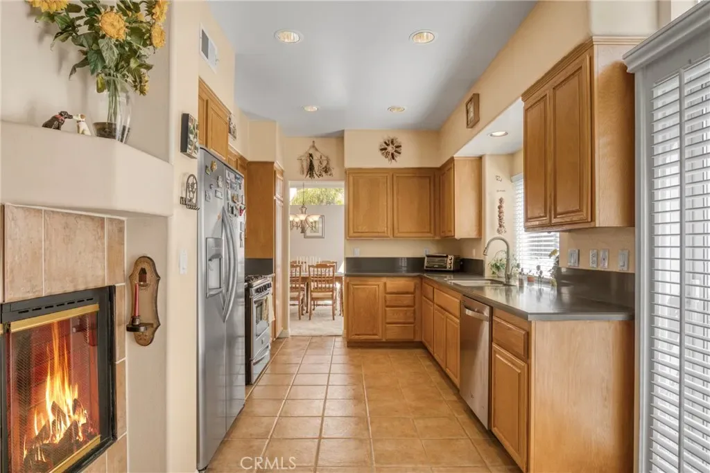 Vaulted ceilings and abundant natural light enhance the main living area, where a fireplace adds warmth and character. The kitchen includes stainless steel appliances, ample cabinetry, and a separate dining area that creates a defined and inviting space.
