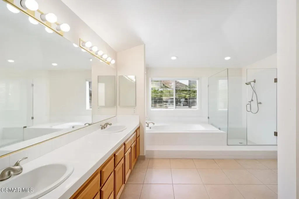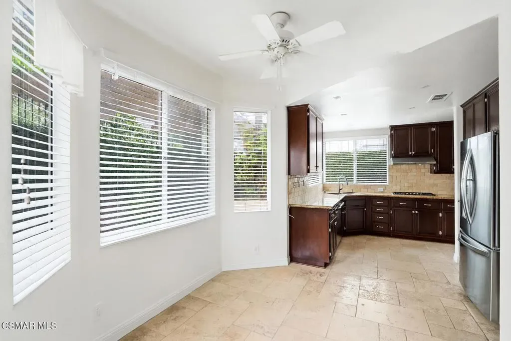 Located in the prestigious Hillcrest Estate community, this Oak Park gem offers an ideal blend of suburban tranquility and urban convenience. Perfectly positioned in the city’s heart, this residence is within close proximity to an array of restaurants, shops, and a Starbucks. This luminous home boasts an open floor plan with vaulted ceilings, flooding the interior with natural light. The well-maintained 3-bedroom, 2.5-bathroom home features elegant upgrades, including exotic walnut hardwood floors, a new roof, and a built-in alarm system. The updated gourmet kitchen, equipped with granite countertops, professional-grade Thermador stainless steel appliances, and travertine flooring, flows seamlessly into the adjacent breakfast nook, family room, and backyard. The family room, adorned with a marble and travertine fireplace, offers a picturesque view of the beautifully landscaped backyard, designed for effortless entertaining. The private backyard is a true oasis, featuring a large built-in barbecue area with an outdoor refrigerator, mature vines draping the walls, and a charming corner fountain that evokes a vacation-like ambiance. The spacious primary bedroom showcases vaulted ceilings, a double-sided fireplace, and a luxurious en-suite bathroom with dual sinks, a walk-in closet, a large tub, and a separate shower. Upstairs, two additional bright and generously sized bedrooms have access to a full bathroom with a bathtub/shower combo. Attention to detail is evident throughout, from the stone walkway and patio to the mature landscaping and recessed lighting, all contributing to the home’s warm and inviting atmosphere. With top-rated schools, hiking, biking trails, and parks nearby, this residence perfectly combines comfort, prime location, and convenience.
