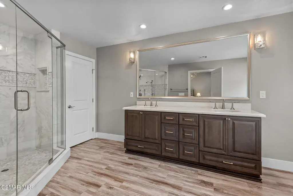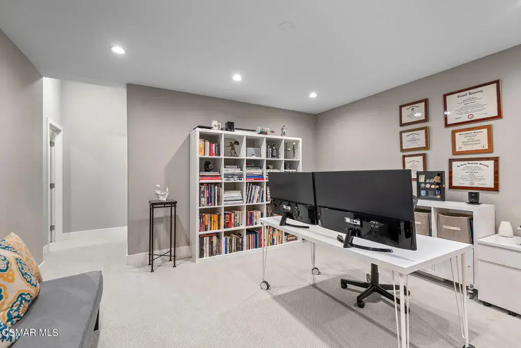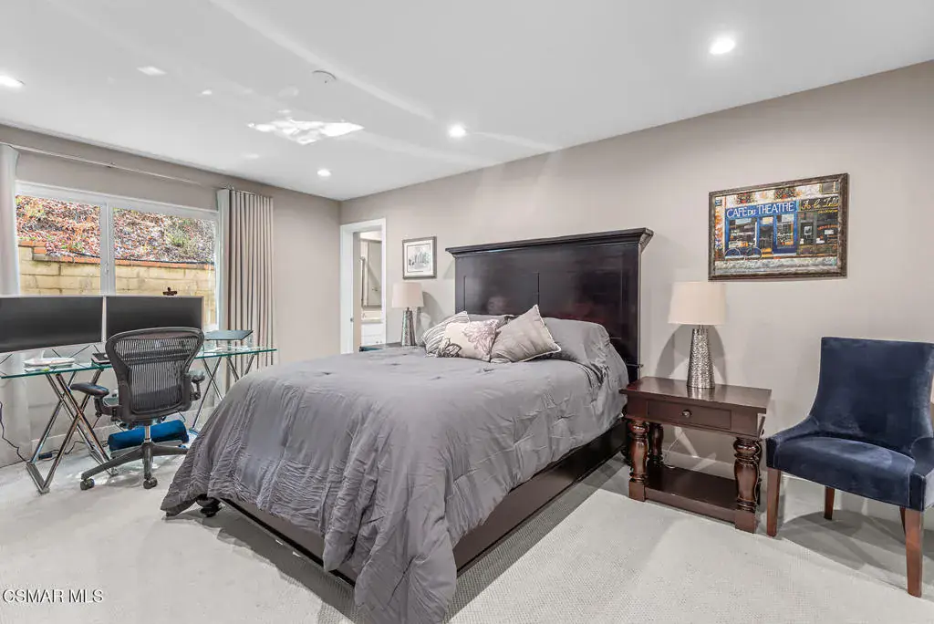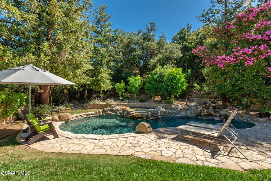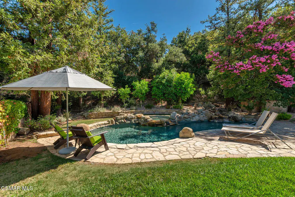 Reimagined for connection, comfort, and the ease of single-story living, this expansive Oak Park residence offers a rare blend of space, privacy, and resort-style atmosphere within a quiet cul-de-sac setting. Designed for those who value flexibility and flow, the approximately 4,300-square-foot layout lives larger than expected and presents a unique opportunity for multigenerational living, extended guests, or a private work-from-home retreat.A welcoming foyer opens beneath soaring vaulted ceilings — the home’s unforgettable first impression — where natural light and generous proportions create an airy sense of scale. Formal living and dining spaces feel both open and inviting, ideal for gatherings large or small, while a substantial game and bonus room with 7-speaker surround sound provides a dedicated space for movie nights, recreation, or relaxed entertaining.At the heart of the home, the chef’s kitchen and great room connect seamlessly to the informal dining area and backyard beyond, encouraging effortless indoor-outdoor living. Walls of glass frame views of mature pines, oaks, and sunset-tinted mountain skies, while multiple access points lead to outdoor entertaining areas and a well-appointed BBQ center.The serene primary suite offers a peaceful escape with dual closets and a spa-inspired bath featuring a freestanding slipper tub, expansive vanity, oversized shower, and private water closet. Three secondary bedrooms each enjoy remodeled ensuite baths, and a separate office with full bath and large closet creates a flexible wing ideal for extended family or guests.Surrounded by citrus trees and lush landscaping, the private backyard delivers a true social retreat — complete with a remodeled pool and spa, tranquil waterfalls, circular fire-pit lounge, and spaces designed for year-round California evenings.Additional highlights include an owned Panasonic solar system with two Tesla Powerwalls, EV charger, refreshed landscaping with updated irrigation and drainage, and a coveted location within the Oak Park school district near parks, trails, and local shopping. Rare in both size and layout, this single-story home offers the scale of a custom estate with the warmth and lifestyle of Oak Park living.