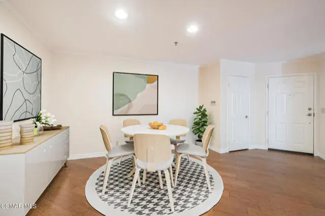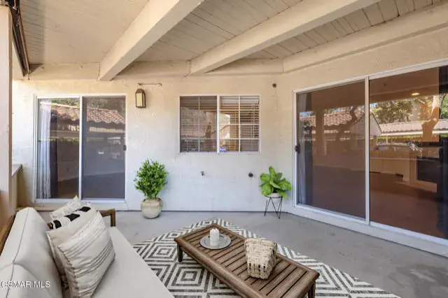 Nestled in the desirable Shadow Ridge community of Oak Park, this meticulously maintained ground-level home is located in the highly regarded Oak Park School District. Freshly painted and featuring warm, neutral tones throughout, this 2-bedroom, 2-bathroom unit boasts beautiful wood floors and an open-concept living and dining area, complete with a cozy fireplace and covered patio. The kitchen offers stainless steel appliances, granite countertops, and generous storage space. The spacious secondary bedroom features a sliding door that leads to a shared patio and just across the hall, you’ll find a beautifully updated bathroom with a granite vanity and a tub/shower combo. The primary suite is a tranquil retreat, complete with a large walk-in closet and an updated en-suite bathroom featuring granite counters, a tub/shower combo, and a private patio. The unit also includes a laundry/utility room with space for a full-size washer and dryer. Shadow Ridge offers resort-style living, featuring two pools, tennis and racquetball courts, a volleyball court, gym, sauna, and clubhouse. HOA fees cover cable with HBO and Cinemax, high-speed internet, and fire and earthquake insurance. With its prime location, this home provides easy access to shopping, dining, top-rated schools, parks, and scenic hiking and biking trails.