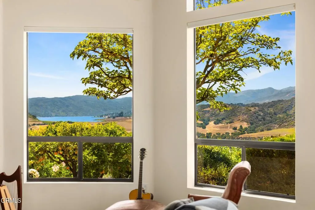 This Mediterranean-style gem, designed by acclaimed architect Marc Whitman, is one of the rare few in the Ojai Valley to offer panoramic views of Lake Casitas and the surrounding mountains. At its heart is a chef’s kitchen featuring a Wolf oven, Sub-Zero Pro Series refrigerator and custom alder cabinetry. The living room draws you in with soaring ceilings and expansive glass windows – ideal for soaking in unforgettable sunrises and sunsets.Thoughtfully upgraded throughout, the home includes eco-certified wood flooring, custom alder built-ins and energy-efficient dual-pane windows. Renovations include a new roof and a glass-enclosed Four Seasons sunroom which doubles as a personal gym or wellness retreat. The guest area, with its own entrance and complete privacy, is perfect for multigenerational living, visiting friends and family, or as a spacious home office or studio. The three-car garage with tool bench and cabinets offers both ample parking and plenty of storage space. Step outside to 5.6 acres of natural beauty and thriving organic fruit trees – including avocado, orange, tangerine, lemon, lime, grapefruit, pomelo, and more. The property is a haven for wildlife lovers with visits from hummingbirds, great horned owls and red-tailed hawks. An adjoining flat lot with water and electricity is ready for your vision – whether it’s a pickleball court or second dwelling. Ideally located just 10 minutes from downtown Ojai and less than 15 minutes from the beach, you’ll enjoy cool ocean breezes and easy access to shops, restaurants, and local culture. Meticulously maintained and move-in ready, this exceptional property offers the quintessential Ojai Valley lifestyle – rich in views, nature, and comfort.