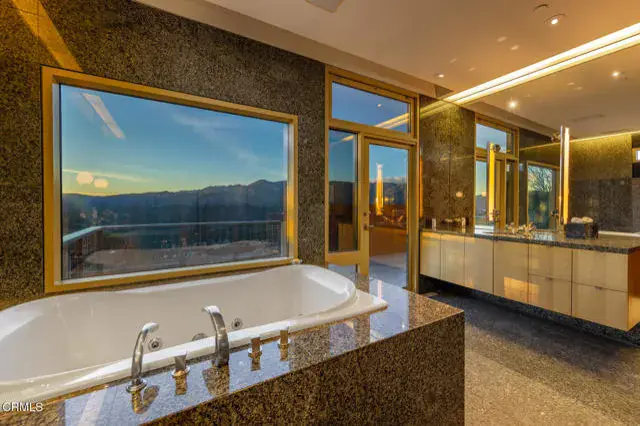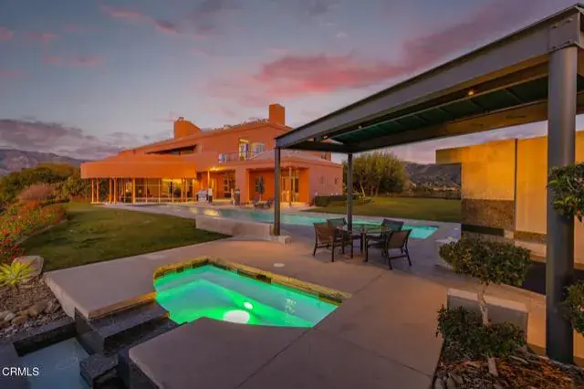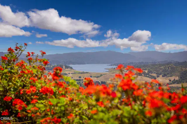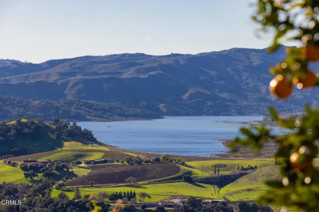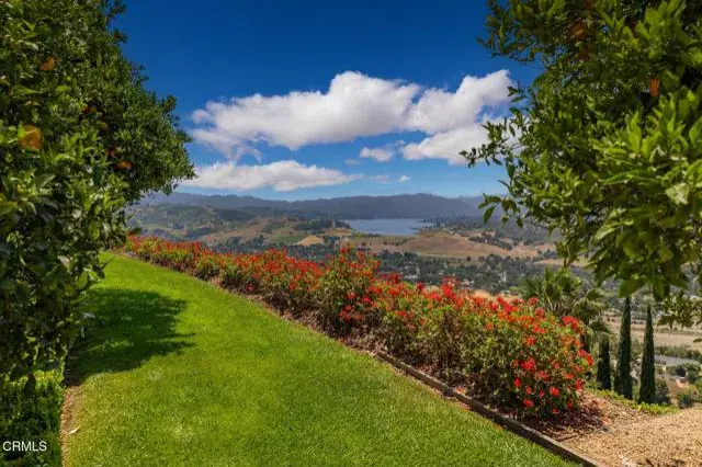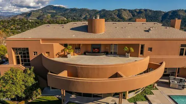 This contemporary architecturalmarvel is perched upon a hill with sweeping views of Lake Casitas and all of the mountainsthat ring the Ojai Valley. The 6br/6ba, 7600sqftvilla was built to the highest luxury standards and appointed with taste and elegance. It is offered as a complete package, including all furniture, a fully equipped kitchen, artworkand luxury linens. With modern lines and circular accents, the design maximizes the feeling of space and light with high ceilings and massive windows. The main living room has a semi-circular glass wall that offers an awesome 180 degree view, above which is a 2000 sqft verandawith a fireplace that opens to the sky and creates a commanding perch from which to observe the vast valley below. The living spacesare built to take advantage the incredible vantage point with strategically placed windows,each offering a unique perspective onthe sweeping vistas. The main entrance introduces the house with a unique circular wall opening that reveals an inside garden, a Tokonoma, and a two story central area that leads to the different parts of the house. The main living room blends curves and angles to create an elegant gathering space, with ample seating, a large fireplace, textured limestone floors, stone accents and automatic shades for the glass wall. The open kitchen/dining room complex includes a dining table with lake views, a fireplace, a breakfast area for morning sun and two built in desks. It is appointed with ultra – high end appliances, modern lighting and custom hardwood cabinetry. The spacious primary suite includes a fireplace sitting area, Topa Topa views, and a spa – like granite bathroom with a private porch overlooking the lake. There is a well – appointed gym, a circular 3rd floor sitting room with perfect views of the Topa Topas, and a media room with an extra- large projection screen. The house is filled with high end AV equipment for audiophile sound, automatic shades and artistic lighting. The grounds include impeccable landscaping. The pool, spa and outdoor dining area are completely private and offer sun, shade, sky and unrivaled views. An organic family orchard produces a variety of fruits. The unparalleled design, quality and sheer beauty of this house integrate the natural splendor of its surroundings. This property represents high concept design, exquisite craftsmanship, & the finest natural materials in a complete turnkey package ready to occupy immediately.