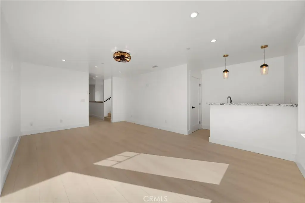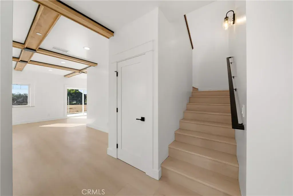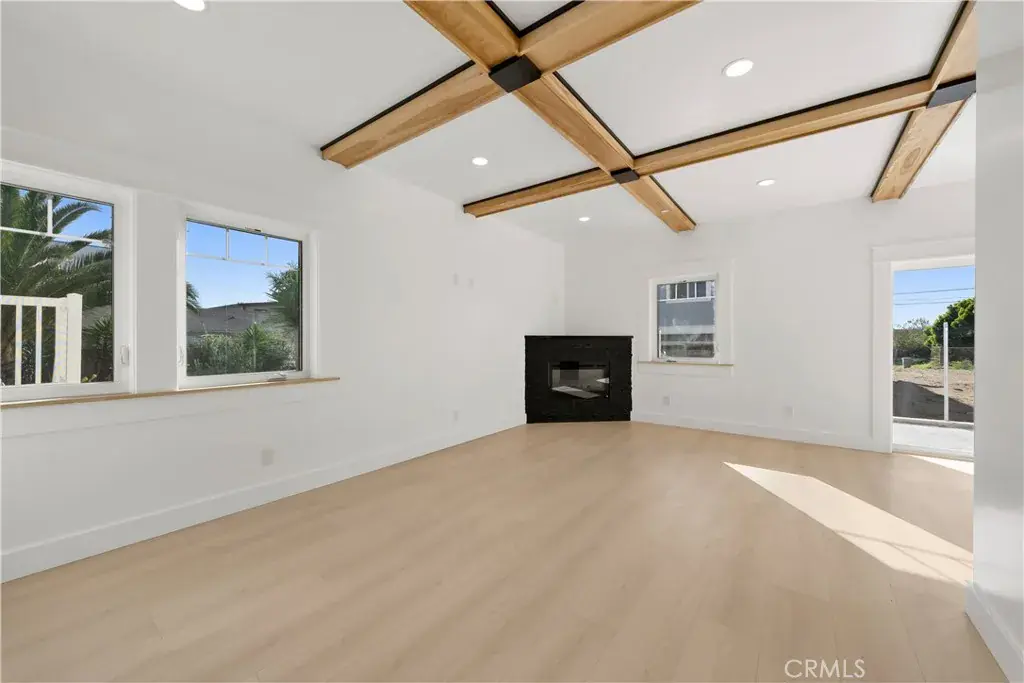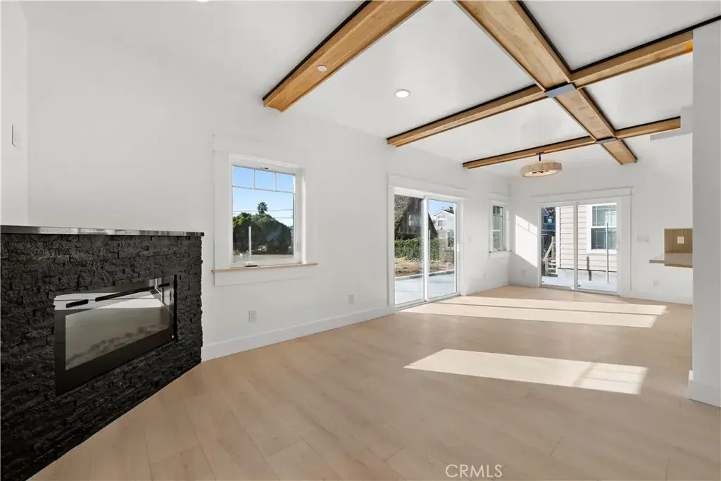 The main living level is designed as a cohesive, open-concept space connecting the living room, dining area, and kitchen. Wide-plank flooring, a coffered ceiling with wood beam accents, recessed lighting, and a modern gas fireplace create a refined yet comfortable atmosphere. Two large sliding doors open to the backyard and stamped concrete patio, allowing for seamless indoor–outdoor living.